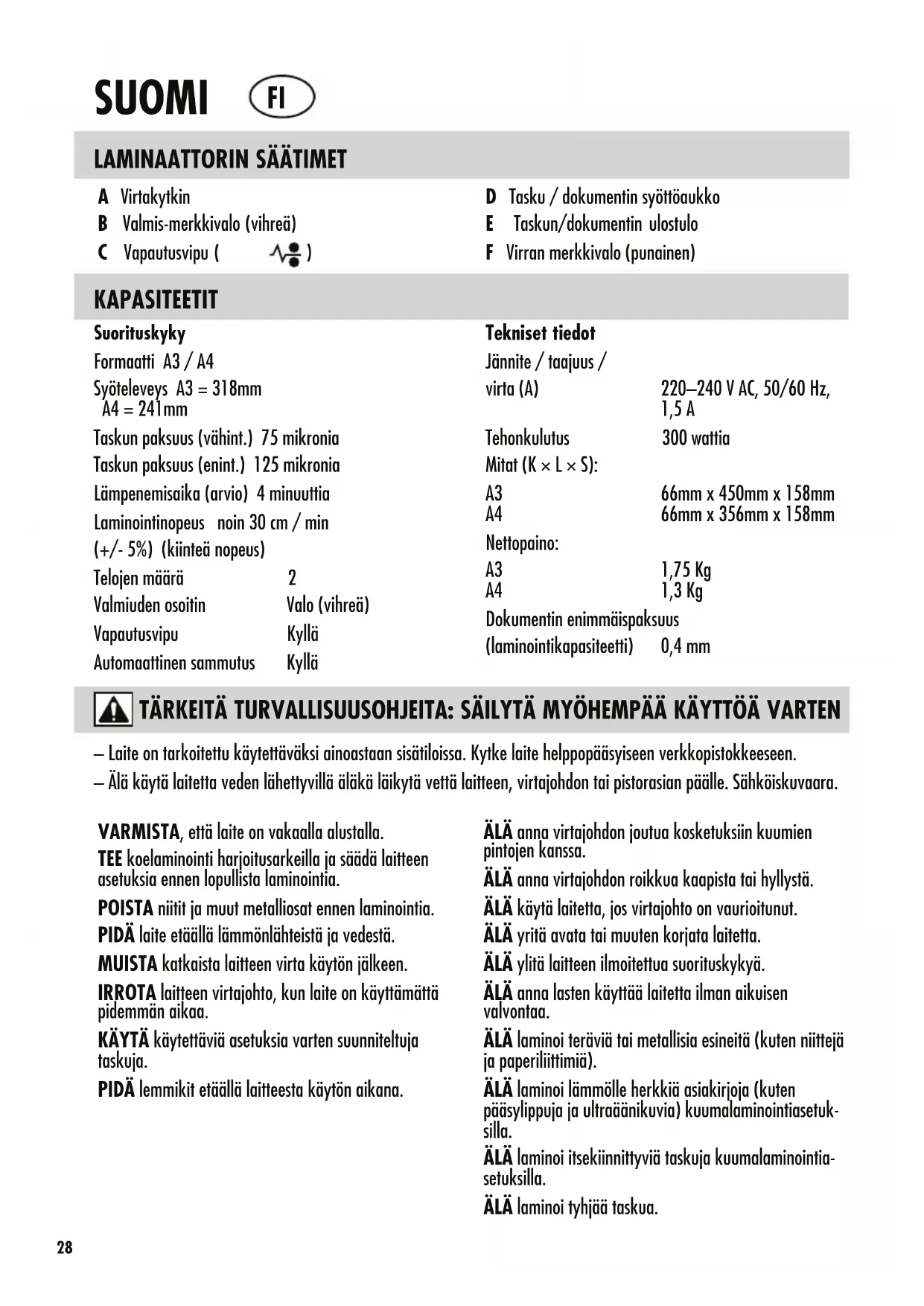 D Tasku / dokumentin syöttöaukko E Taskun/dokumentin ulostulo F Virran merkkivalo (punainen) KAPASITEETIT – Laite on tarkoitettu käytettäväksi ainoastaan sisätiloissa. Kytke laite helppopääsyiseen verkkopistokkeeseen. – Älä käytä laitetta veden lähettyvillä äläkä läikytä vettä laitteen, virtajohdon tai pistorasian päälle. Sähköiskuvaara. VARMISTA, että laite on vakaalla alustalla. TEE koelaminointi harjoitusarkeilla ja säädä laitteen asetuksia ennen lopullista laminointia. POISTA niitit ja muut metalliosat ennen laminointia. PIDÄ laite etäällä lämmönlähteistä ja vedestä. MUISTA katkaista laitteen virta käytön jälkeen. IRROTA laitteen virtajohto, kun laite on käyttämättä pidemmän aikaa. KÄYTÄ käytettäviä asetuksia varten suunniteltuja taskuja. PIDÄ lemmikit etäällä laitteesta käytön aikana. ÄLÄ anna virtajohdon joutua kosketuksiin kuumien pintojen kanssa. ÄLÄ anna virtajohdon roikkua kaapista tai hyllystä. ÄLÄ käytä laitetta, jos virtajohto on vaurioitunut. ÄLÄ yritä avata tai muuten korjata laitetta. ÄLÄ ylitä laitteen ilmoitettua suorituskykyä. ÄLÄ anna lasten käyttää laitetta ilman aikuisen valvontaa. ÄLÄ laminoi teräviä tai metallisia esineitä (kuten niittejä ja paperiliittimiä). ÄLÄ laminoi lämmölle herkkiä asiakirjoja (kuten pääsylippuja ja ultraäänikuvia) kuumalaminointiasetuk- silla. ÄLÄ laminoi itsekiinnittyviä taskuja kuumalaminointia- setuksilla. ÄLÄ laminoi tyhjää taskua. Suorituskyky Formaatti A3 / A4 Syöteleveys A3 = 318mm A4 = 241mm Taskun paksuus (vähint.) 75 mikronia Taskun paksuus (enint.) 125 mikronia Lämpenemisaika (arvio) 4minuuttia Laminointinopeus noin 30cm / min (+/- 5%) (kiinteä nopeus) Telojen määrä 2 Valmiuden osoitin Valo (vihreä) Vapautusvipu Kyllä Automaattinen sammutus Kyllä Tekniset tiedot Jännite / taajuus / virta (A) 220–240VAC, 50/60Hz, 1,5A Tehonkulutus 300wattia Mitat (K × L × S): A3 66mm x 450mm x 158mm A4 66mm x 356mm x 158mm Nettopaino: A3 1,75 Kg A4 1,3 Kg Dokumentin enimmäispaksuus (laminointikapasiteetti) 0,4 mmOMINAISUUKSIA JA VINKKEJÄ VapautustoimintoTaskun voi poistaa tai kohdistaa uudelleen laminoinnin aikana laitteen takaosassa olevan vapautusvivun avulla. Tasku voidaan poistaa vain syöttöaukon kautta, kun vipua käytetään.Automaattinen sammutusLaite siirtyy 30 minuutin kuluttua automaattis-esti automaattisen sammutuksen tilaan. Virran merkkivalo vilkkuu punaisena viiden minuutin ajan ja sammuu sitten. Valmis-merkkivalo sammuu. Jatka laitteen käyttöä painamalla virtakytkintä. Laite nollautuu.t Parhaaseen tulokseen päästään käyttämällä Fellowes®-taskuja: 80–125 mikronia.t Tässä laitteessa ei tarvitse käyttää kelkkaa laminointia varten. Siinä on kelkaton mekanismi.t Aseta laminoitava kohde aina sopivan kokoiseen taskuun.t Tee aina koelaminointi samankokoisella ja -paksuisella kohteella ennen lopullista prosessia.t Valmistele tasku ja kohde laminointia varten. Aseta kohde taskun keskelle siten, että se koskettaa suljettua etureunaa. Varmista, että tasku ei ole kohteelle liian suuri.t Leikkaa ylimääräinen materiaali kohteen ympäriltä tarvittaessa laminoinnin ja jäähdytyksen jälkeen.