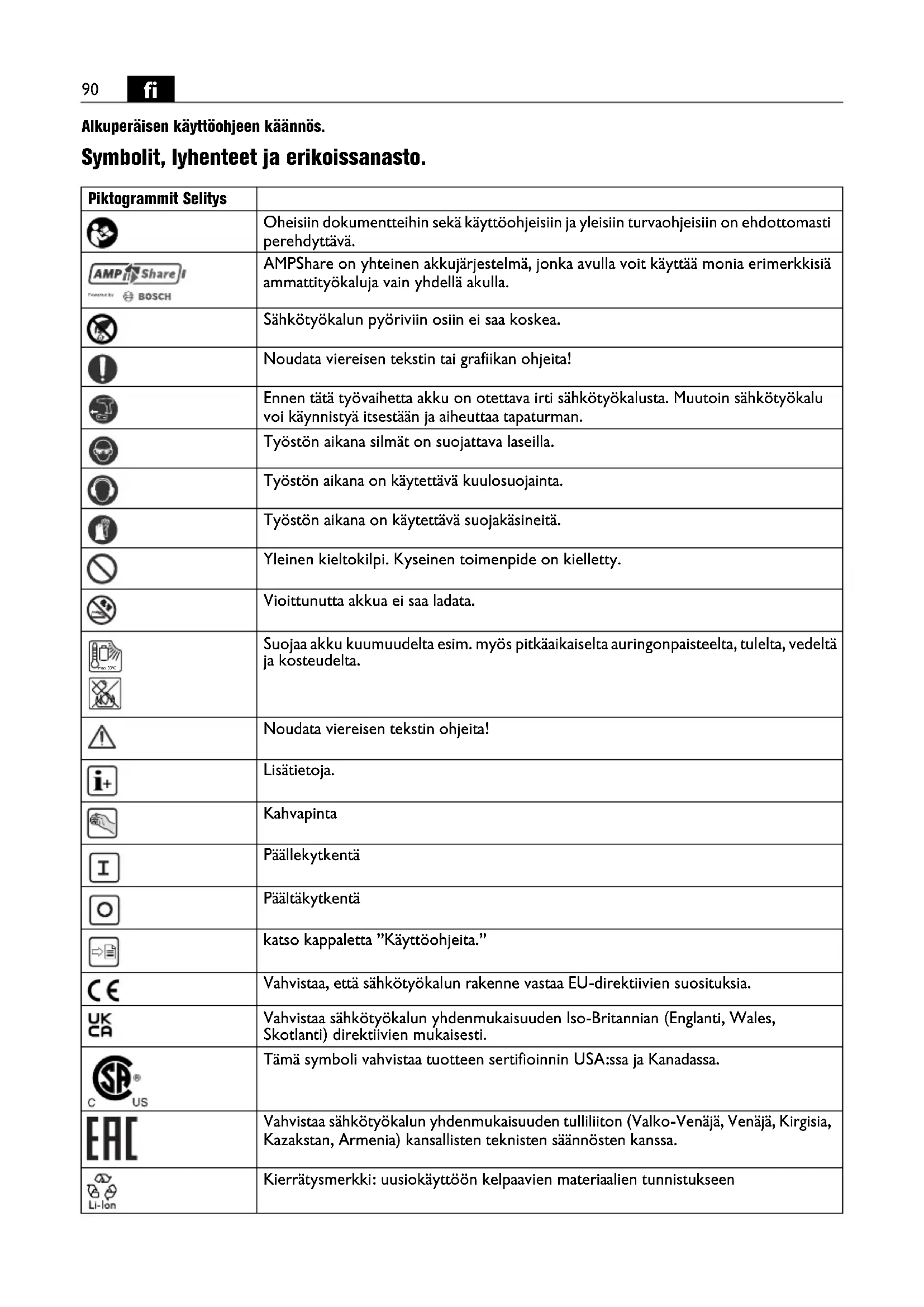Alkuperäisen käyttöohjeen käännös. Symbolit, lyhenteet ja erikoissanasto. Piktogrammit Selitys Oheisiin dokumentteihin sekä käyttöohjeisiin ja yleisiin turvaohjeisiin on ehdottomasti perehdyttävä. AMPShare on yhteinen akkujärjestelmä, jonka avulla voit käyttää monia erimerkkisiä ammattityökaluja vain yhdellä akulla. Sähkötyökalun pyöriviin osiin ei saa koskea. Noudata viereisen tekstin tai grafiikan ohjeita! Ennen tätä työvaihetta akku on otettava irti sähkötyökalusta. Muutoin sähkötyökalu voi käynnistyä itsestään ja aiheuttaa tapaturman. Työstön aikana silmät on suojattava laseilla. Työstön aikana on käytettävä kuulosuojainta. Työstön aikana on käytettävä suojakäsineitä. Yleinen kieltokilpi. Kyseinen toimenpide on kielletty. Vioittunutta akkua ei saa ladata. Suojaa akku kuumuudelta esim. myös pitkäaikaiselta auringonpaisteelta, tulelta, vedeltä ja kosteudelta. Noudata viereisen tekstin ohjeita! Lisätietoja. Kahvapinta Päällekytkentä Päältäkytkentä katso kappaletta ”Käyttöohjeita.” Vahvistaa, että sähkötyökalun rakenne vastaa EU-direktiivien suosituksia. Vahvistaa sähkötyökalun yhdenmukaisuuden Iso-Britannian (Englanti, Wales, Skotlanti) direktiivien mukaisesti. Tämä symboli vahvistaa tuotteen sertifioinnin USA:ssa ja Kanadassa. Vahvistaa sähkötyökalun yhdenmukaisuuden tulliliiton (Valko-Venäjä, Venäjä, Kirgisia, Kazakstan, Armenia) kansallisten teknisten säännösten kanssa. Kierrätysmerkki: uusiokäyttöön kelpaavien materiaalien tunnistukseen max.50°C91