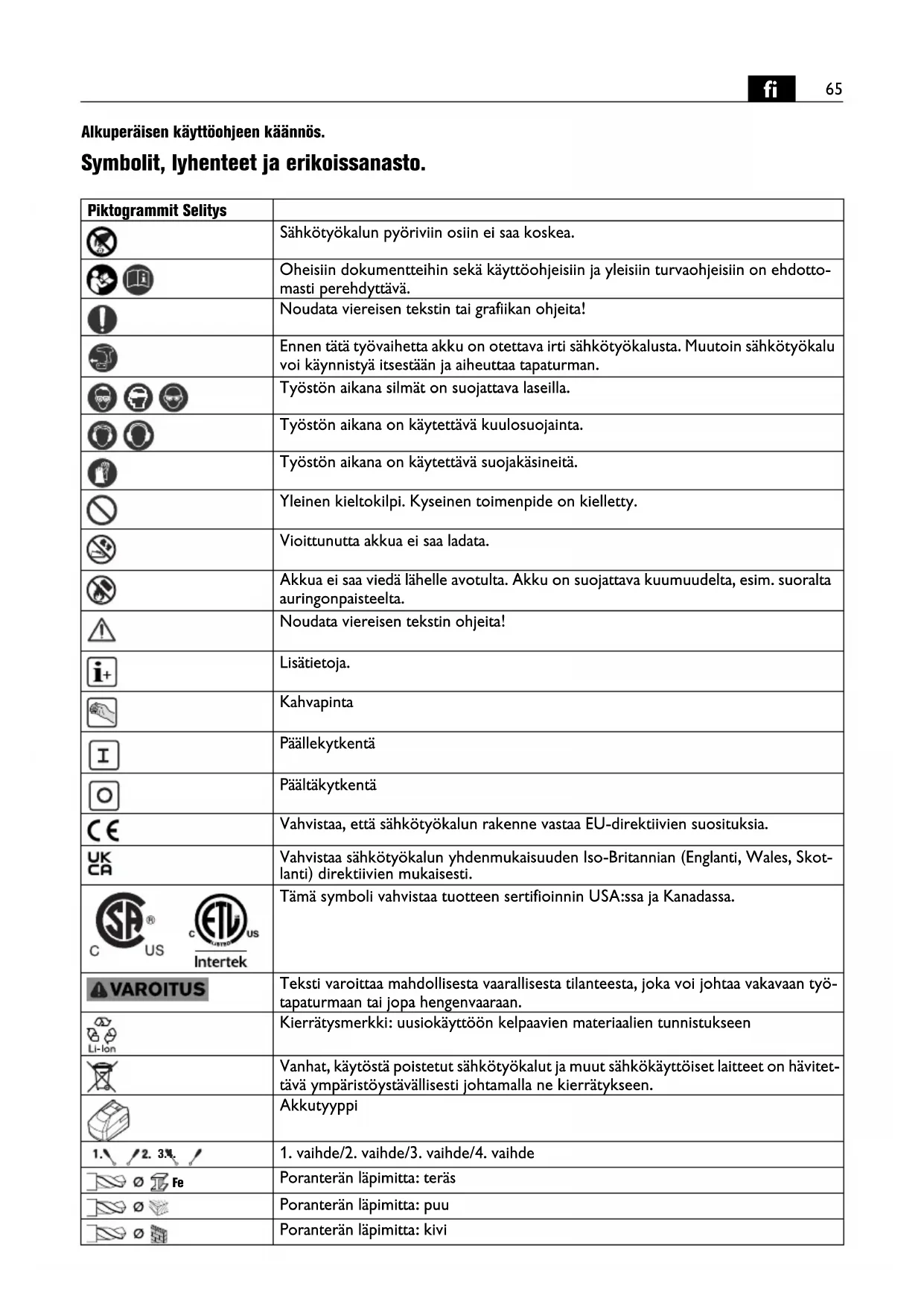 | CE | Vahvistaa, että sähkötyökalun rakenne vastaa EU-direktiivien suosituksia. |