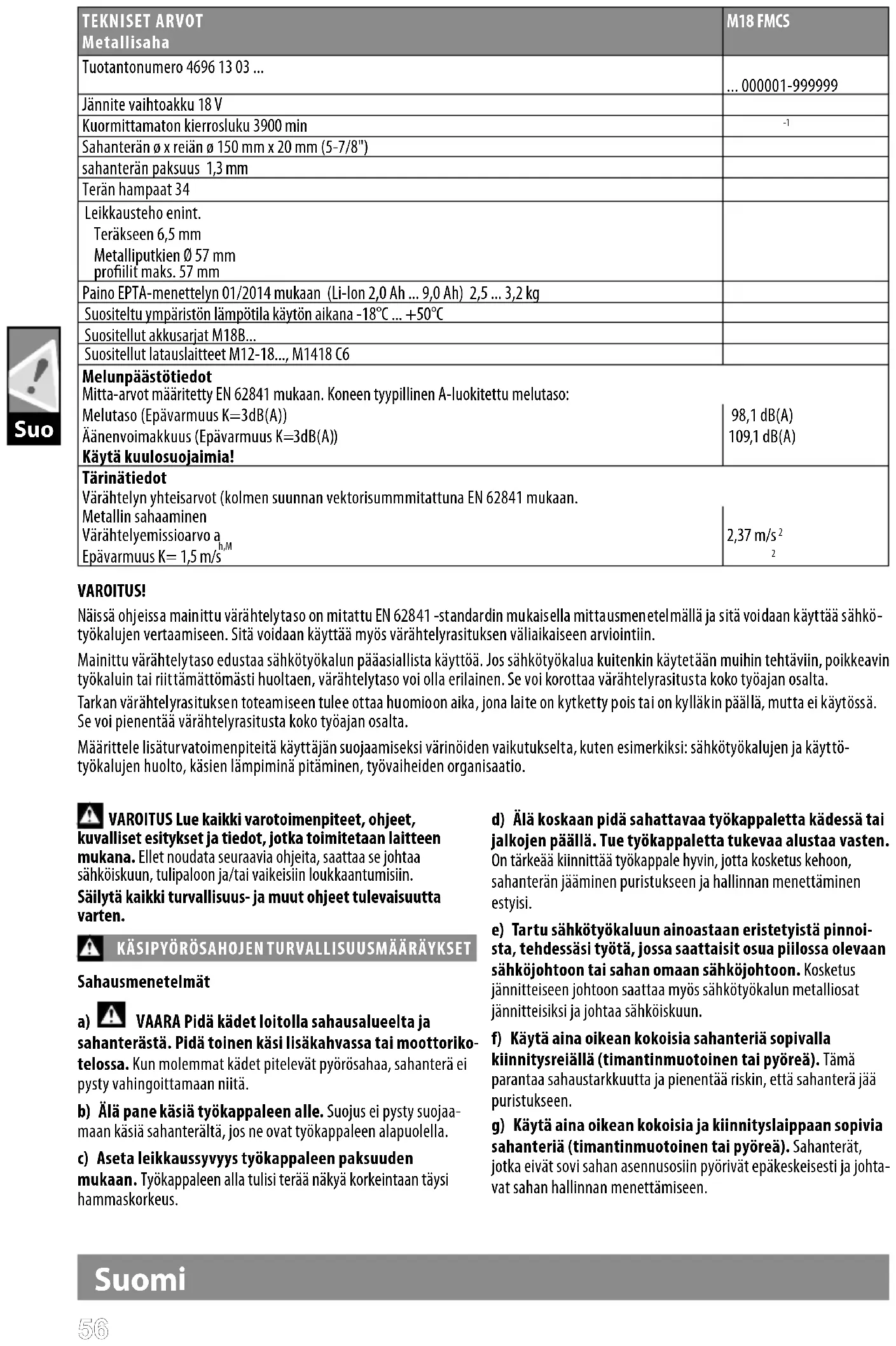 Sahanterän ø x reiän ø 150 mm x 20 mm (5-7/8") sahanterän paksuus 1,3 mm Terän hampaat 34 Leikkausteho enint. Teräkseen 6,5 mm Metalliputkien Ø 57 mm proilit maks. 57 mm Paino EPTA-menettelyn 01/2014 mukaan (Li-Ion 2,0 Ah ... 9,0 Ah) 2,5 ... 3,2 kg Suositeltu ympäristön lämpötila käytön aikana -18°C ... +50°C Suositellut akkusarjat M18B... Suositellut latauslaitteet M12-18..., M1418 C6 Melunpäästötiedot Mitta-arvot määritetty EN 62841 mukaan. Koneen tyypillinen A-luokitettu melutaso: Melutaso (Epävarmuus K=3dB(A)) 98,1 dB(A) Äänenvoimakkuus (Epävarmuus K=3dB(A)) 109,1 dB(A) Käytä kuulosuojaimia! Tärinätiedot Värähtelyn yhteisarvot (kolmen suunnan vektorisummmitattuna EN 62841 mukaan. Metallin sahaaminen Värähtelyemissioarvo a h,M 2,37 m/s
