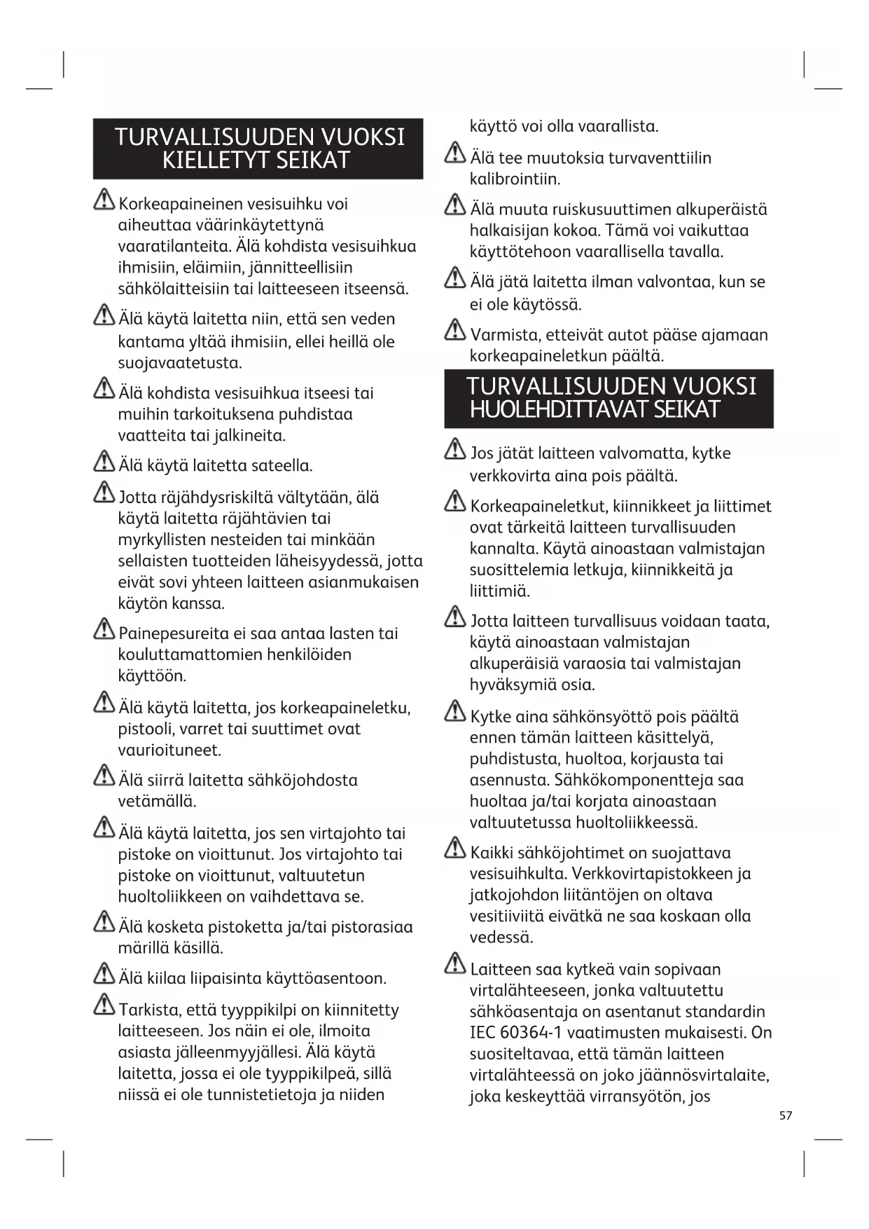 Suuttimen puhdistustyökalu Turvasäädökset / muut riskit SYMBOLIT: Lue käyttöohje VAROITUS, HUOMAUTUS tai VAARA Sähkövaara Laite ei sovellu liitettäväksi juomakelpoisen veden liitäntään. Älä koskaan osoita vesipistoolilla kohti ihmisiä, eläimiä, jännitteellisiä sähkölaitteita tai laitetta itseään. Laitteen eristysluokka on luokka II. Tämä merkitsee vahvistettua tai kaksoiseristystä. Laite on asianmukaisten eurooppalaisten direktiivien mukainen.57 TURVALLISUUDEN VUOKSI KIELLETYT SEIKAT Korkeapaineinen vesisuihku voi aiheuttaa väärinkäytettynä vaaratilanteita. Älä kohdista vesisuihkua ihmisiin, eläimiin, jännitteellisiin sähkölaitteisiin tai laitteeseen itseensä. Älä käytä laitetta niin, että sen veden kantama yltää ihmisiin, ellei heillä ole suojavaatetusta. Älä kohdista vesisuihkua itseesi tai muihin tarkoituksena puhdistaa vaatteita tai jalkineita. Älä käytä laitetta sateella. Jotta räjähdysriskiltä vältytään, älä käytä laitetta räjähtävien tai myrkyllisten nesteiden tai minkään sellaisten tuotteiden läheisyydessä, jotta eivät sovi yhteen laitteen asianmukaisen käytön kanssa. Painepesureita ei saa antaa lasten tai kouluttamattomien henkilöiden käyttöön. Älä käytä laitetta, jos korkeapaineletku, pistooli, varret tai suuttimet ovat vaurioituneet. Älä siirrä laitetta sähköjohdosta vetämällä. Älä käytä laitetta, jos sen virtajohto tai pistoke on vioittunut. Jos virtajohto tai pistoke on vioittunut, valtuutetun huoltoliikkeen on vaihdettava se. Älä kosketa pistoketta ja/tai pistorasiaa märillä käsillä. Älä kiilaa liipaisinta käyttöasentoon. Tarkista, että tyyppikilpi on kiinnitetty laitteeseen. Jos näin ei ole, ilmoita asiasta jälleenmyyjällesi. Älä käytä laitetta, jossa ei ole tyyppikilpeä, sillä niissä ei ole tunnistetietoja ja niiden käyttö voi olla vaarallista. Älä tee muutoksia turvaventtiilin kalibrointiin. Älä muuta ruiskusuuttimen alkuperäistä halkaisijan kokoa. Tämä voi vaikuttaa käyttötehoon vaarallisella tavalla. Älä jätä laitetta ilman valvontaa, kun se ei ole käytössä. Varmista, etteivät autot pääse ajamaan korkeapaineletkun päältä. TURVALLISUUDEN VUOKSI HUOLEHDITTAVAT SEIKAT Jos jätät laitteen valvomatta, kytke verkkovirta aina pois päältä. Korkeapaineletkut, kiinnikkeet ja liittimet ovat tärkeitä laitteen turvallisuuden kannalta. Käytä ainoastaan valmistajan suosittelemia letkuja, kiinnikkeitä ja liittimiä. Jotta laitteen turvallisuus voidaan taata, käytä ainoastaan valmistajan alkuperäisiä varaosia tai valmistajan hyväksymiä osia. Kytke aina sähkönsyöttö pois päältä ennen tämän laitteen käsittelyä, puhdistusta, huoltoa, korjausta tai asennusta. Sähkökomponentteja saa huoltaa ja/tai korjata ainoastaan valtuutetussa huoltoliikkeessä. Kaikki sähköjohtimet on suojattava vesisuihkulta. Verkkovirtapistokkeen ja jatkojohdon liitäntöjen on oltava vesitiiviitä eivätkä ne saa koskaan olla vedessä. Laitteen saa kytkeä vain sopivaan virtalähteeseen, jonka valtuutettu sähköasentaja on asentanut standardin IEC 60364-1 vaatimusten mukaisesti. On suositeltavaa, että tämän laitteen virtalähteessä on joko jäännösvirtalaite, joka keskeyttää virransyötön, jos58 vuotovirta maahan ylittää 30 mA 30 ms:n ajan, tai laite joka testaa maapiirin. Käytä aina tätä laitetta käyttäessäsi asianmukaisia henkilösuojaimia mukaan lukien turvasaappaita, käsineitä, ja kuulonsuojaimia. Pidä pistoolista tukevasti kiinni ennen liipaisimen painamista takaiskun estämiseksi. Varmista, että painepesuri on kytketty vedensyöttöön paikallisten säädösten mukaisesti. Sammuta katkaisin ja vedensyöttö käytön jälkeen. Paina sitten liipaisinta, jotta paine poistuu laitteesta ennen letkun tai pistoolin irrottamista. Jos näin ei toimita, seurauksena voi olla henkilö- tai laitevaurio, kun korkeapaineista vettä purkautuu laitteesta. Tarkasta ennen jokaista käyttökertaa, että virtajohto, pistoke ja laitteen tärkeät osat, kuten korkeapaineletku, pistooli ja turvalaitteet eivät ole vioittuneet. Käytä ainoastaan pesuaineita, jotka eivät syövytä valmistajan suositteleman korkeapaineletkun/sähköjohdon pinnoitemateriaaleja. Muiden pesuaineiden tai kemikaalien käyttö voi heikentää laitteen turvallisuutta. Varmista, että kaikki ihmiset ja eläimet ovat vähintään 15 metrin etäisyydellä. Huolehdi, että etäisyys on vähintään 30 cm, kun käytät vesisuihkua maalattujen pintojen puhdistukseen. Näin vältät maalipinnan vaurioitumisen. Tätä laitetta on käytettävä paikallisten vedensyöttöön liittyvien vaatimusten mukaisesti, ks. kohta Asennus – Veden syöttöliitäntä. Sähköturvallisuus Jos virtajohto vioittuu millään tavalla, se on annettava valtuutetun henkilön vaihdettavaksi. Ota yhteys valtuutettuun huoltokeskukseen. Jos pistoke vioittuu millään tavalla, se on annettava valtuutetun henkilön vaihdettavaksi. Vaihtopistoke on johdotettava seuraavien ohjeiden mukaan. TÄRKEÄÄ: Koska tämän laitteen verkkovirtajohdon johtimien värit eivät välttämättä vastaa pistokkeen liitinten värejä tai tunnistemerkintöjä, sinun on toimittava seuraavasti: Sininen johdin on liitettävä NEUTRAALIIN liittimeen, joka voi olla merkitty kirjaimella N tai olla sininen tai musta. Ruskea johdin on liitettävä JÄNNITTEELLISEEN liittimeen, joka voi olla merkitty kirjaimella L tai olla ruskea tai punainen. Jos olet epävarma, ota yhteys valtuutettuun sähköasentajaan. Yleiset tiedot