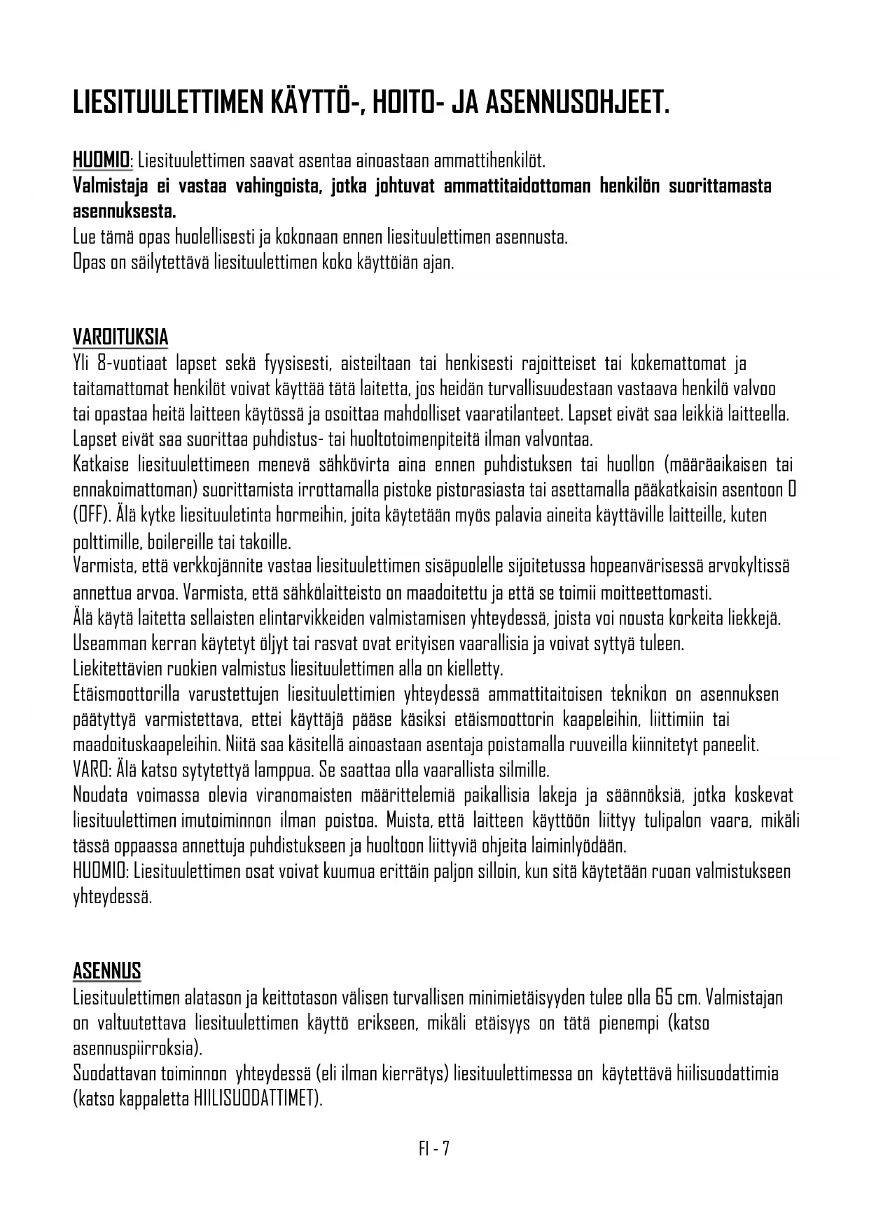 LIESITUULETTIMEN KÄYTTÖ-, HOITO- JA ASENNUSOHJEET. HUOMIO: Liesituulettimen saavat asentaa ainoastaan ammattihenkilöt. Valmistaja ei vastaa vahingoista, jotka johtuvat ammattitaidottoman henkilön suorittamasta asennuksesta. Lue tämä opas huolellisesti ja kokonaan ennen liesituulettimen asennusta. Opas on säilytettävä liesituulettimen koko käyttöiän ajan.