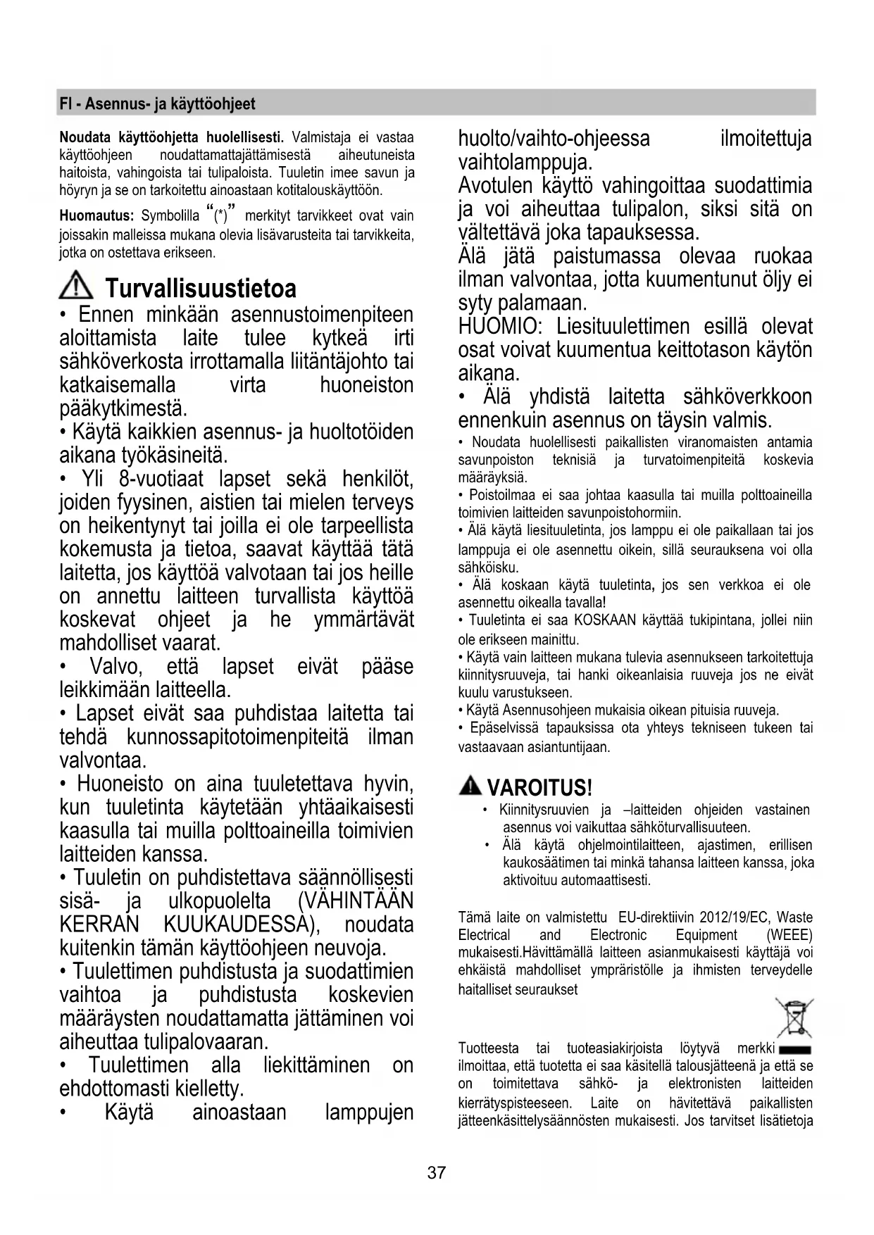 - Huoneisto on aina tuuletettava hyvin, kun tuuletinta käytetään yhtäaikaisesti kaasulla tai muilla polttoaineilla toimivien laitteiden kanssa.