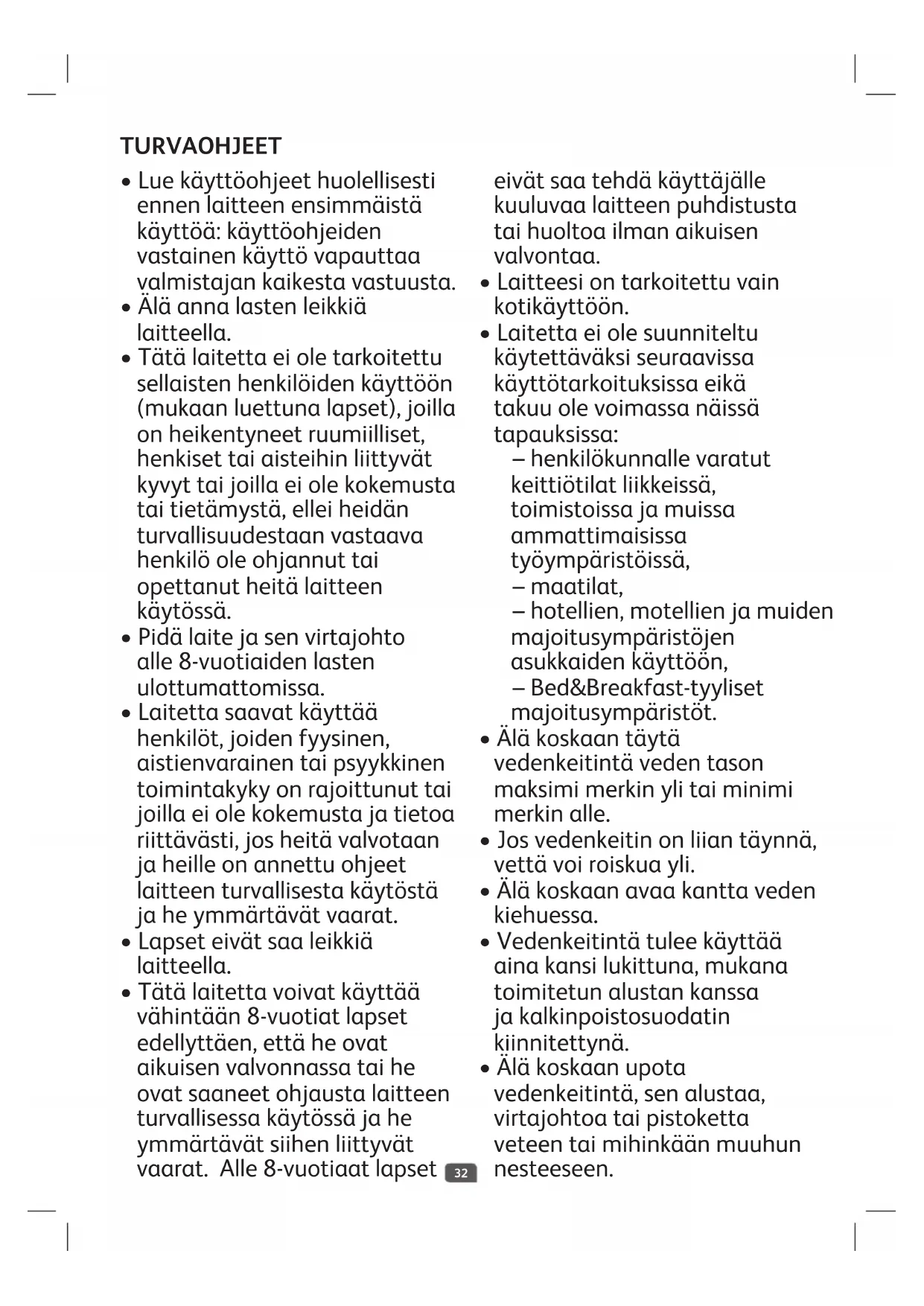 - Älä koskaan upota vedenkeitintä, sen alustaa, virtajohtoa tai pistoketta veteen tai mihinkään muuhun nesteeseen. TURVAOHJEET33
