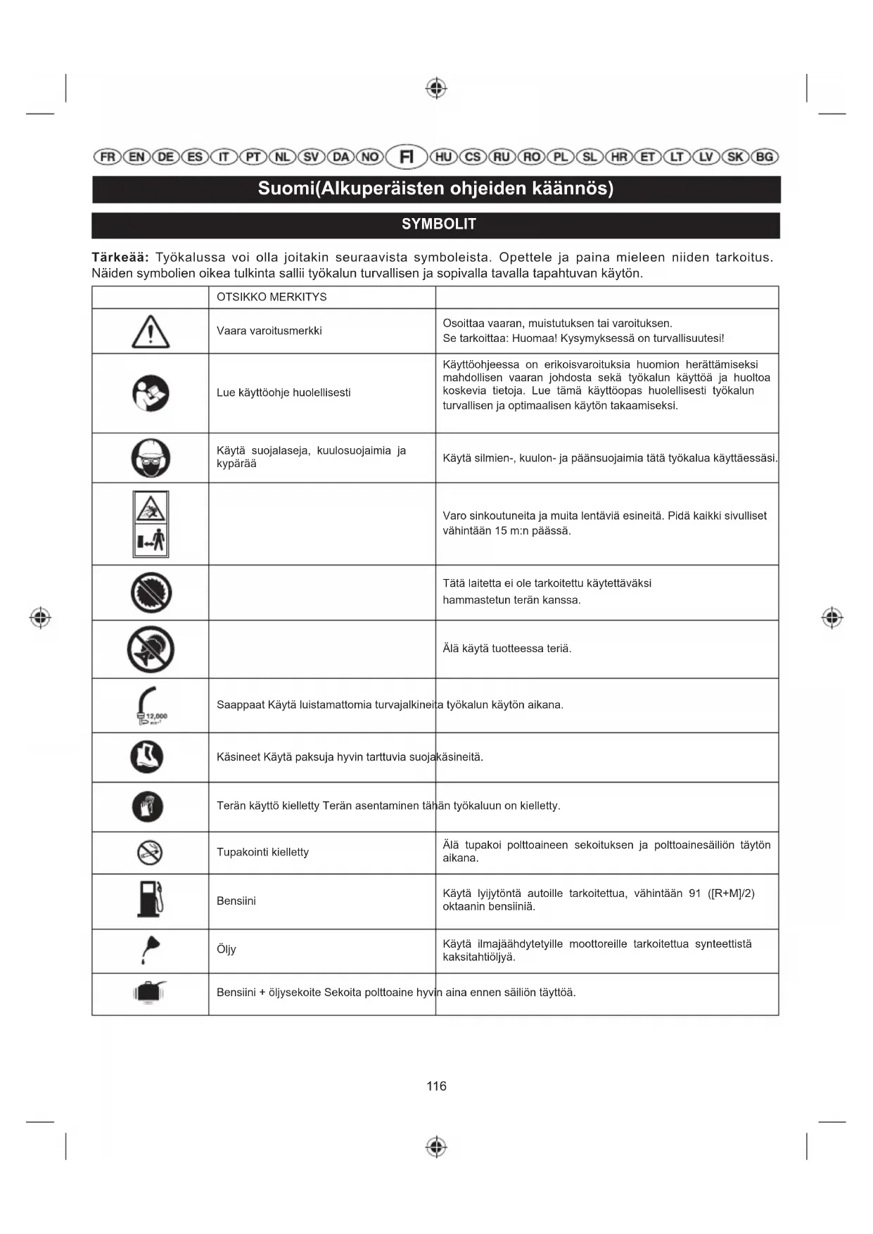 og rengjøring av luftfilteret".116 Suomi(Alkuperäisten ohjeiden käännös) SYMBOLIT Tärkeää: Työkalussa voi olla joitakin seuraavista symboleista. Opettele ja paina mieleen niiden tarkoitus. Näiden symbolien oikea tulkinta sallii työkalun turvallisen ja sopivalla tavalla tapahtuvan käytön. OTSIKKO MERKITYS Vaara varoitusmerkki Osoittaa vaaran, muistutuksen tai varoituksen. Se tarkoittaa: Huomaa! Kysymyksessä on turvallisuutesi! Lue käyttöohje huolellisesti Käyttöohjeessa on erikoisvaroituksia huomion herättämiseksi mahdollisen vaaran johdosta sekä työkalun käyttöä ja huoltoa koskevia tietoja. Lue tämä käyttöopas huolellisesti työkalun turvallisen ja optimaalisen käytön takaamiseksi. Käytä suojalaseja, kuulosuojaimia ja kypärää Käytä silmien-, kuulon- ja päänsuojaimia tätä työkalua käyttäessäsi. Varo sinkoutuneita ja muita lentäviä esineitä. Pidä kaikki sivulliset vähintään 15 m:n päässä. Tätä laitetta ei ole tarkoitettu käytettäväksi hammastetun terän kanssa. Älä käytä tuotteessa teriä. Saappaat Käytä luistamattomia turvajalkineita työkalun käytön aikana. Käsineet Käytä paksuja hyvin tarttuvia suojakäsineitä. Terän käyttö kielletty Terän asentaminen tähän työkaluun on kielletty. Tupakointi kielletty Älä tupakoi polttoaineen sekoituksen ja polttoainesäiliön täytön aikana. Bensiini Käytä lyijytöntä autoille tarkoitettua, vähintään 91 ([R+M]/2) oktaanin bensiiniä. Öljy Käytä ilmajäähdytetyille moottoreille tarkoitettua synteettistä kaksitahtiöljyä. Bensiini + öljysekoite Sekoita polttoaine hyvin aina ennen säiliön täyttöä.117 Suomi(Alkuperäisten ohjeiden käännös) Katkaisin Käynnistys/katkaisin I = käynnistys O = katkaisu Käyntiasento Aseta rikastinvipu asentoon «FULL». Aseta rikastinvipu asentoon «HALF». Aseta käynnistyskytkin asentoon «I» (Päällä). Paina pumppauspalloa 10 kertaa. Käynnistä moottori nykäisemällä käynnistimen kahvasta. Käytä laitetta puristamalla kaasuttimen lukitusta ja kaasuliipaisinta. Odotusaika 10 sekuntia Pysäytä moottori siirtämällä virtalukko ”O”-pysäytysasentoon. To stop the unti: Place the engine switch to the "O" position. Tämä työkalu on sen EU-maan kaikkien sääntömääräisten standardien mukainen, josta se on ostettu. EurAsian-vaatimustenmukaisuusmerkki. Ukrainalainen säädöstenmukaisuusmerkintä Seuraavat signaalisanat ja merkitykset on tarkoitettu selittämään tähän tuotteeseen liittyviä riskin tasoja.