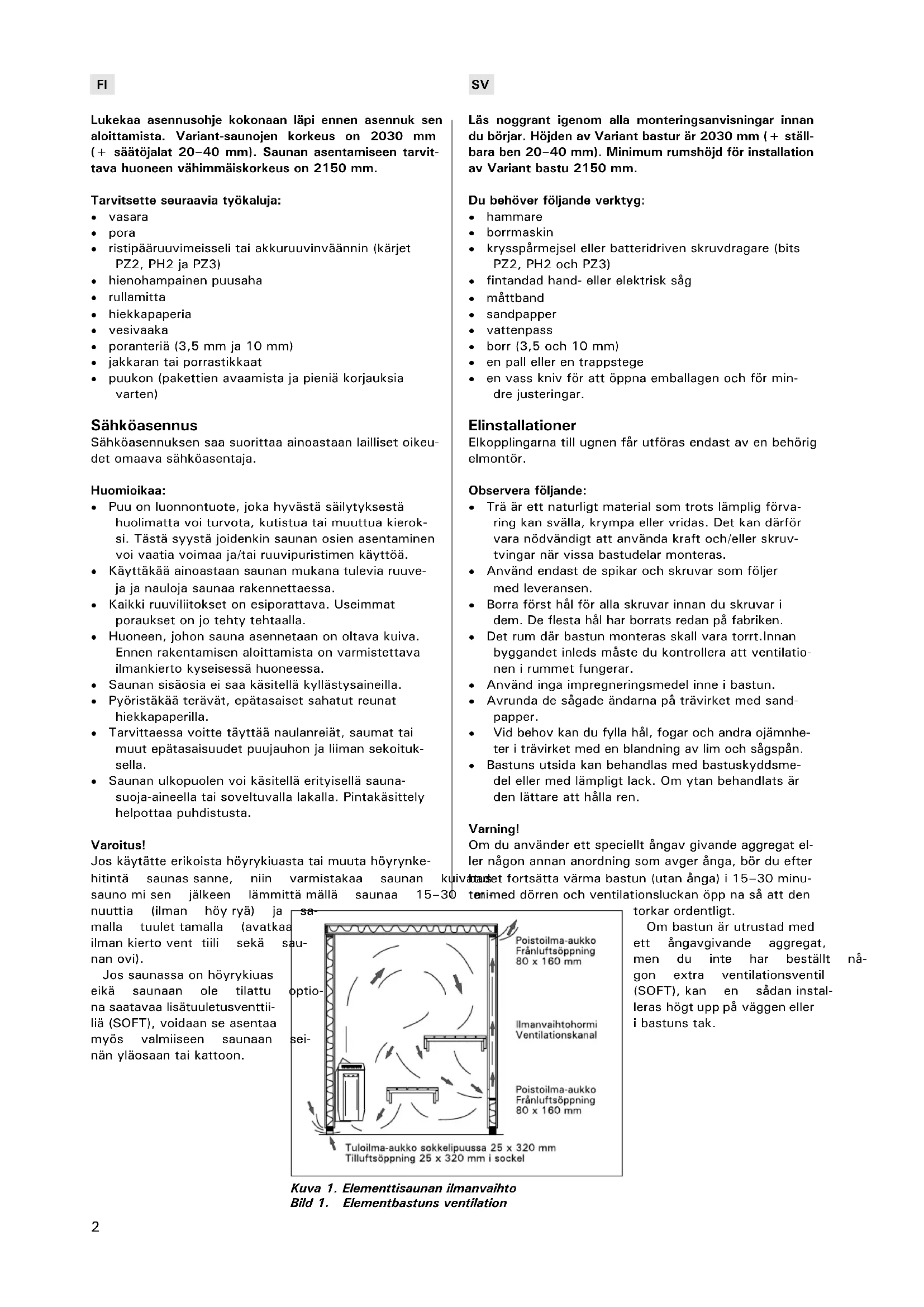 Lukekaa asennusohje kokonaan läpi ennen asennuk sen aloittamista. Variant-saunojen korkeus on 2030 mm (+ säätöjalat 20–40 mm). Saunan asentamiseen tarvit- tava huoneen vähimmäiskorkeus on 2150 mm. Tarvitsette seuraavia työkaluja: