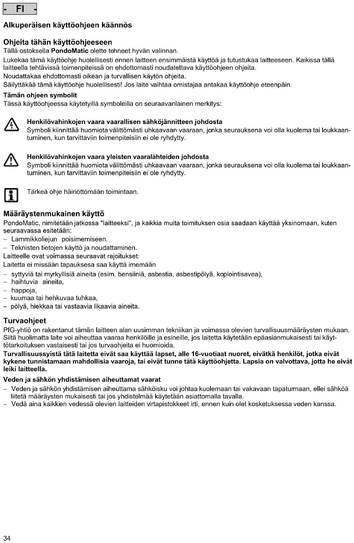 PfG-yhtio on rakentanut tämän laitteen alan uusimman tekniikan ja voimassa olevien turvallisuusmaäräysten mukaan. Siita huolimatta laite voi aiheuttaa vaaraa henkilöille ja esineille, jos laitetta käytetään epääasianmukaisesti tai käytöttarkoituksen vastaisesti tai jos turvaohjeita ei huomioida.
