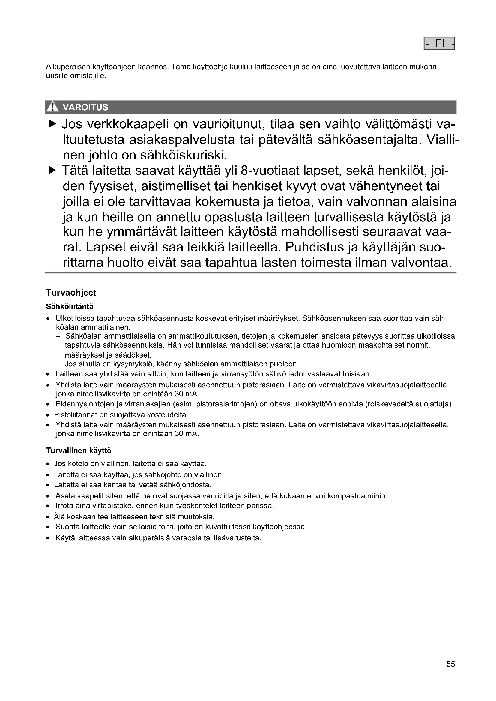 VAROIT US VAROITUS Jos verkkokaapeli on vaurioitunut, tilaa sen vaihto välittömästi va- ltuutetusta asiakaspalvelusta tai pätevältä sähköasentajalta. Vialli- nen johto on sähköiskuriski. Tätä laitetta saavat käyttää yli 8-vuotiaat lapset, sekä henkilöt, joi- den fyysiset, aistimelliset tai henkiset kyvyt ovat vähentyneet tai joilla ei ole tarvittavaa kokemusta ja tietoa, vain valvonnan alaisina ja kun heille on annettu opastusta laitteen turvallisesta käytöstä ja kun he ymmärtävät laitteen käytöstä mahdollisesti seuraavat vaa- rat. Lapset eivät saa leikkiä laitteella. Puhdistus ja käyttäjän suo- rittama huolto eivät saa tapahtua lasten toimesta ilman valvontaa.