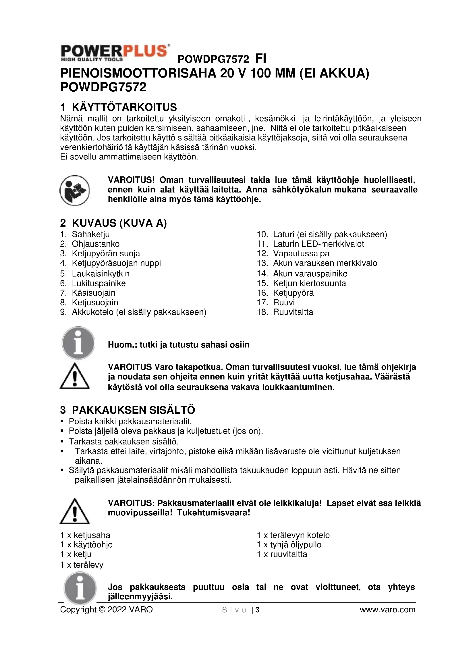 - Säilytä pakkausmateriaalit mikäli mahdollista takuukauden loppuun asti. Hävitä ne sitten paikallisen jätelainsäädännön mukaisesti. VAROITUS: Pakkausmateriaalit eivät ole leikkikaluja! Lapset eivät saa leikkiä muovipusseilla! Tukehtumisvaara! 1 x ketjusaha 1 x käyttöohje 1 x ketju 1 x terälevy 1 x terälevyn kotelo 1 x tyhjä öljypullo 1 x ruuvitaltta Jos pakkauksesta puuttuu osia tai ne ovat vioittuneet, ota yhteys jälleenmyyjääsi.POWDPG7572 FI Copyright © 2022 VARO S i v u | 4 www.varo.com 4 SYMBOLIT Tässä käyttöoppaassa ja koneessa käytetään seuraavia symboleita: