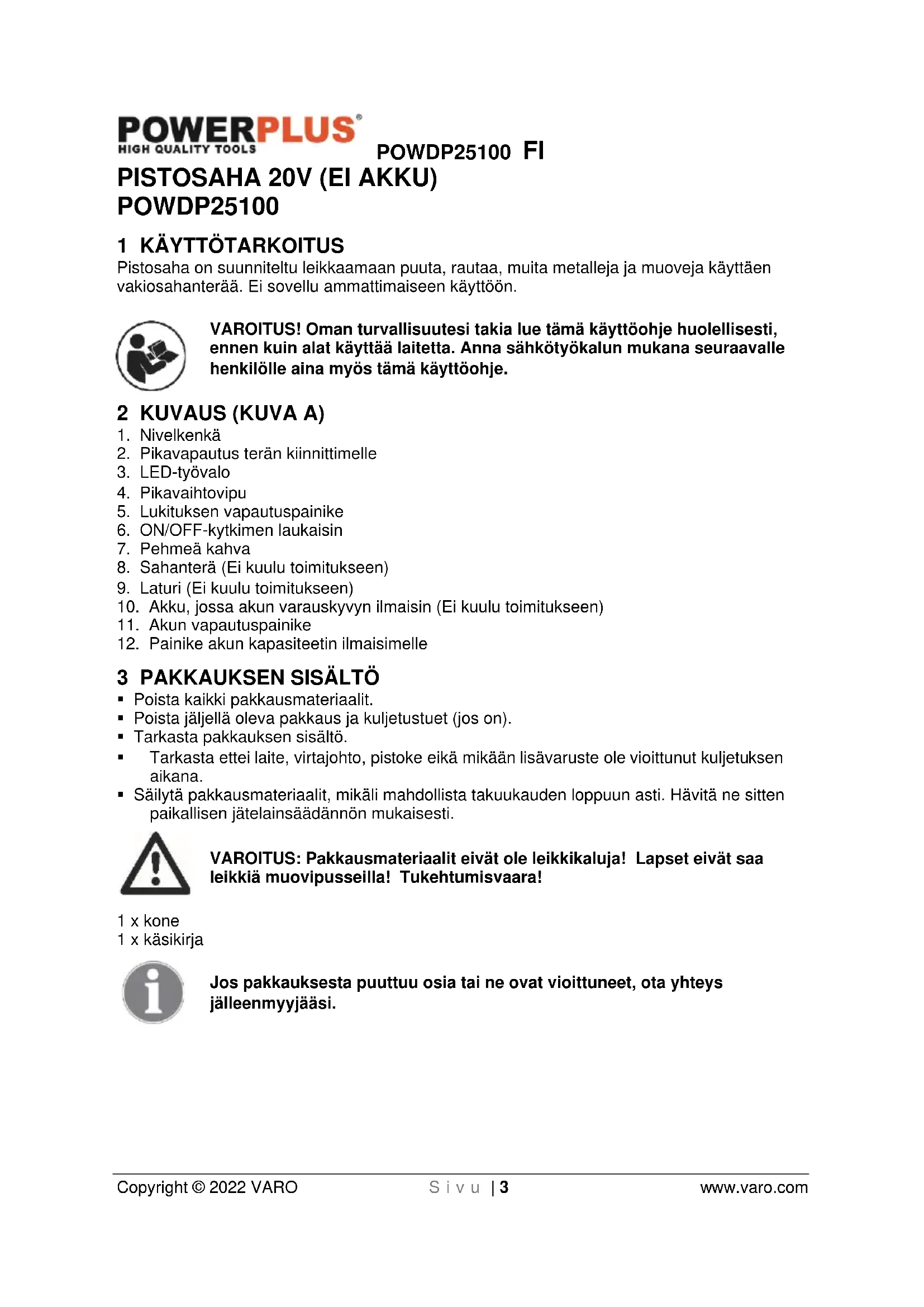 Nimellisjännite 20 V Akkuliitäntä Liu’utettava Leikkuusyvyys teräs 10 mm Leikkuusyvyys puu 120 mm Säädettävä nivelkenkä Kyllä Pikavaihtoterä Kyllä Pehmeä kahva Kyllä Soft touch Kyllä LED-valo Kyllä Männän isku 28 mm 14 MELU Melupäästöjen arvot on mitattu asianmukaisen standardin mukaan. (K=3) Äänenpainetaso LpA 78 dB(A) Äänitehotaso LwA 89 dB(A) HUOMIO! Käytä kuulosuojaimia, kun äänenpaine on yli 85 dB(A). aw (Tärinätaso) 10,8 m/s² K = 1,5 m/s²POWDP25100 FI Copyright © 2022 VARO S i v u | 11 www.varo.com 15 TAKUU