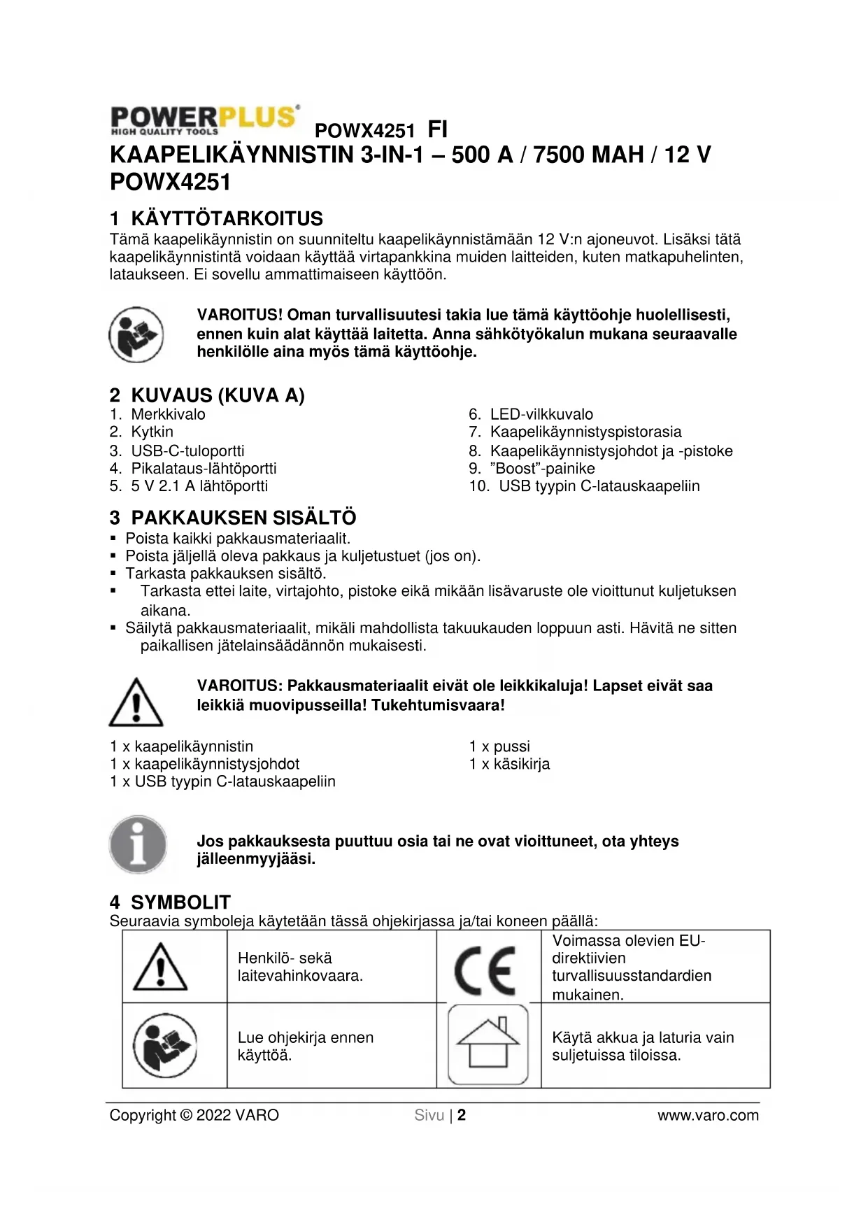 - ÄLÄ altista tuotetta äärimmäiselle kuumuudelle tai tulelle.POWX4251 FI Copyright © 2022 VARO Sivu | 5 www.varo.com