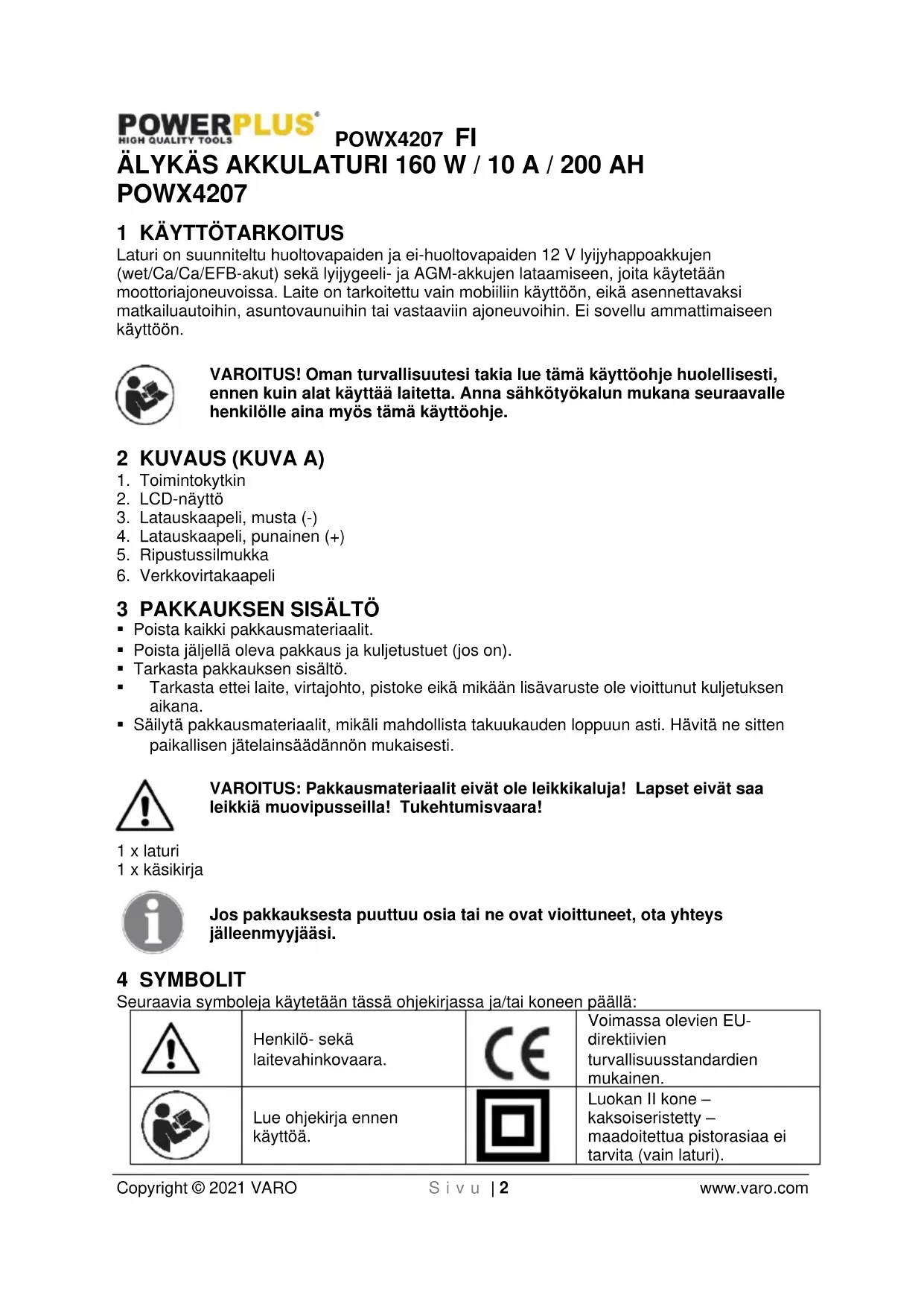 Luokan II kone – kaksoiseristetty – maadoitettua pistorasiaa ei tarvita (vain laturi).POWX4207 FI Copyright © 2021 VARO S i v u | 3 www.varo.com