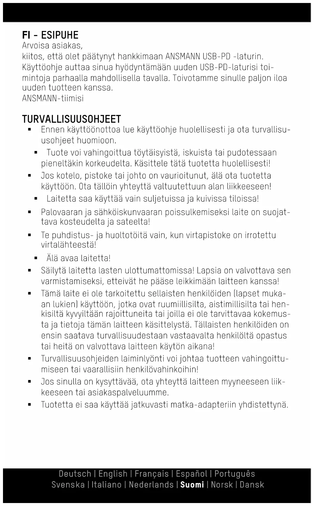 De in deze gebruiksaanwijzing opgenomen informatie kan zonder aankondiging vooraf gewijzigd worden. ANSMANN aanvaardt geen aan- sprakelijkheid voor directe, indirecte, toevallige of overige schade of gevolgschade, die door onvakkundig gebruik of door niet-naleving van de in deze gebruiksaanwijzing aanwezige informatie ontstaat. GARANTIE Wij bieden drie jaar garantie op het apparaat. Bij schade aan het apparaat, die ten gevolge van niet-naleving van de gebruiksaanwijzing ontstaat, kan geen garantie verleend worden. Technische wijzigingen voorbehouden. Voor drukfouten zijn wij niet aansprakelijk. 06/2019 Onze garantiebepalingen vindt u online op www.ansmann.deFI - ESIPUHE Arvoisa asiakas, kiitos, että olet päätynyt hankkimaan ANSMANN USB-PD -laturin. Käyttöohje auttaa sinua hyödyntämään uuden USB-PD-laturisi toi- mintoja parhaalla mahdollisella tavalla. Toivotamme sinulle paljon iloa uuden tuotteen kanssa. ANSMANN-tiimisi TURVALLISUUSOHJEET Ennen käyttöönottoa lue käyttöohje huolellisesti ja ota turvallisu- usohjeet huomioon. Tuote voi vahingoittua töytäisyistä, iskuista tai pudotessaan pieneltäkin korkeudelta. Käsittele tätä tuotetta huolellisesti! Jos kotelo, pistoke tai johto on vaurioitunut, älä ota tuotetta käyttöön. Ota tällöin yhteyttä valtuutettuun alan liikkeeseen! Laitetta saa käyttää vain suljetuissa ja kuivissa tiloissa! Palovaaran ja sähköiskunvaaran poissulkemiseksi laite on suojat- tava kosteudelta ja sateelta! Te puhdistus- ja huoltotöitä vain, kun virtapistoke on irrotettu virtalähteestä! Älä avaa laitetta! Säilytä laitetta lasten ulottumattomissa! Lapsia on valvottava sen varmistamiseksi, etteivät he pääse leikkimään laitteen kanssa! Tämä laite ei ole tarkoitettu sellaisten henkilöiden (lapset muka- an lukien) käyttöön, jotka ovat ruumiillisilta, aistimillisilta tai hen- kisiltä kyvyiltään rajoittuneita tai joilla ei ole tarvittavaa kokemus- ta ja tietoja tämän laitteen käsittelystä. Tällaisten henkilöiden on ensin saatava turvallisuudestaan vastaavalta henkilöltä opastus tai heitä on valvottava laitteen käytön aikana! Turvallisuusohjeiden laiminlyönti voi johtaa tuotteen vahingoittu- miseen tai vaarallisiin henkilövahinkoihin! Jos sinulla on kysyttävää, ota yhteyttä laitteen myyneeseen liik- keeseen tai asiakaspalveluumme. Tuotetta ei saa käyttää jatkuvasti matka-adapteriin yhdistettynä. Deutsch | English | Français | Español | Português Svenska | Italiano | Nederlands | Suomi | Norsk | DanskKÄYTTÖÖNOTTO PD-yhteen- sopiva PD-yhteen
