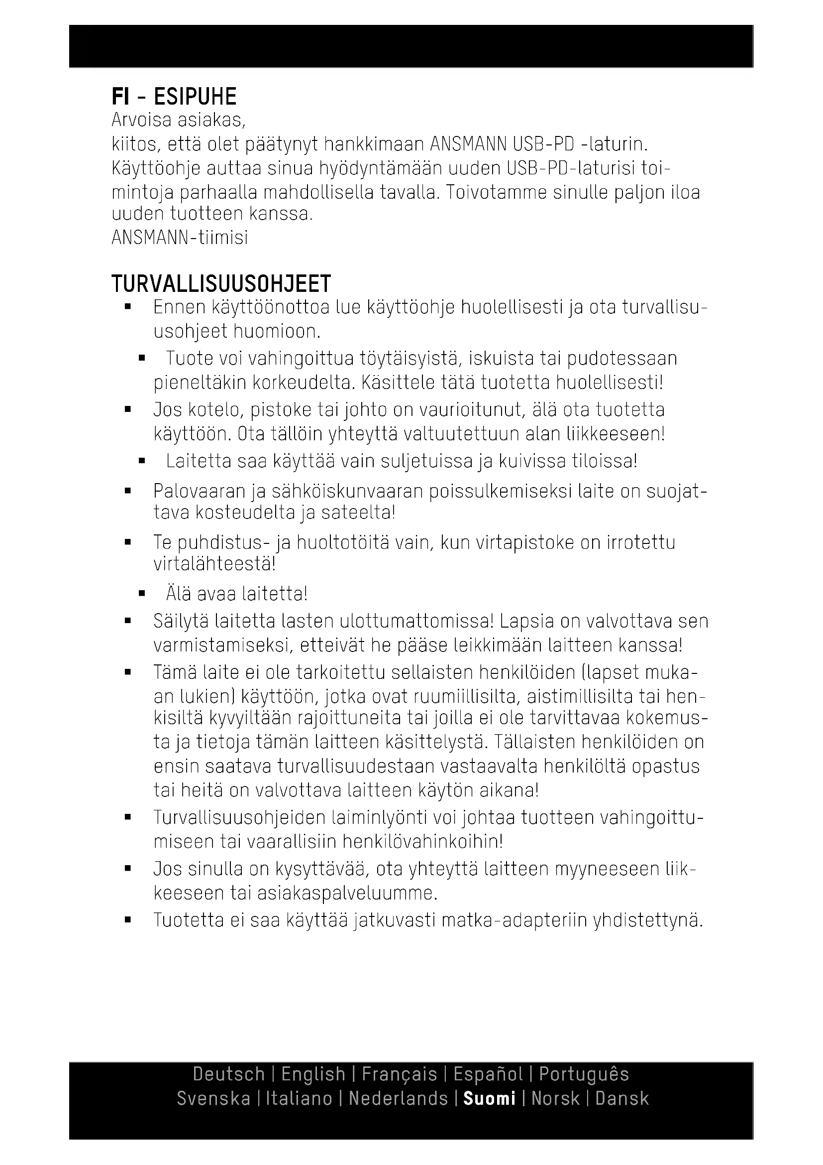 De in deze gebruiksaanwijzing opgenomen informatie kan zonder aankondiging vooraf gewijzigd worden. ANSMANN aanvaardt geen aan- sprakelijkheid voor directe, indirecte, toevallige of overige schade of gevolgschade, die door onvakkundig gebruik of door niet-naleving van de in deze gebruiksaanwijzing aanwezige informatie ontstaat. GARANTIE Wij bieden drie jaar garantie op het apparaat. Bij schade aan het apparaat, die ten gevolge van niet-naleving van de gebruiksaanwijzing ontstaat, kan geen garantie verleend worden. Technische wijzigingen voorbehouden. Voor drukfouten zijn wij niet aansprakelijk. 01/2022 Onze garantiebepalingen vindt u online op www.ansmann.deFI - ESIPUHE Arvoisa asiakas, kiitos, että olet päätynyt hankkimaan ANSMANN USB-PD -laturin. Käyttöohje auttaa sinua hyödyntämään uuden USB-PD-laturisi toi- mintoja parhaalla mahdollisella tavalla. Toivotamme sinulle paljon iloa uuden tuotteen kanssa. ANSMANN-tiimisi TURVALLISUUSOHJEET Ennen käyttöönottoa lue käyttöohje huolellisesti ja ota turvallisu- usohjeet huomioon. Tuote voi vahingoittua töytäisyistä, iskuista tai pudotessaan pieneltäkin korkeudelta. Käsittele tätä tuotetta huolellisesti! Jos kotelo, pistoke tai johto on vaurioitunut, älä ota tuotetta käyttöön. Ota tällöin yhteyttä valtuutettuun alan liikkeeseen! Laitetta saa käyttää vain suljetuissa ja kuivissa tiloissa! Palovaaran ja sähköiskunvaaran poissulkemiseksi laite on suojat- tava kosteudelta ja sateelta! Te puhdistus- ja huoltotöitä vain, kun virtapistoke on irrotettu virtalähteestä! Älä avaa laitetta! Säilytä laitetta lasten ulottumattomissa! Lapsia on valvottava sen varmistamiseksi, etteivät he pääse leikkimään laitteen kanssa! Tämä laite ei ole tarkoitettu sellaisten henkilöiden (lapset muka- an lukien) käyttöön, jotka ovat ruumiillisilta, aistimillisilta tai hen- kisiltä kyvyiltään rajoittuneita tai joilla ei ole tarvittavaa kokemus- ta ja tietoja tämän laitteen käsittelystä. Tällaisten henkilöiden on ensin saatava turvallisuudestaan vastaavalta henkilöltä opastus tai heitä on valvottava laitteen käytön aikana! Turvallisuusohjeiden laiminlyönti voi johtaa tuotteen vahingoittu- miseen tai vaarallisiin henkilövahinkoihin! Jos sinulla on kysyttävää, ota yhteyttä laitteen myyneeseen liik- keeseen tai asiakaspalveluumme. Tuotetta ei saa käyttää jatkuvasti matka-adapteriin yhdistettynä. Deutsch | English | Français | Español | Português Svenska | Italiano | Nederlands | Suomi | Norsk | DanskKÄYTTÖÖNOTTO PD-yhteen- sopiva PD-yhteen