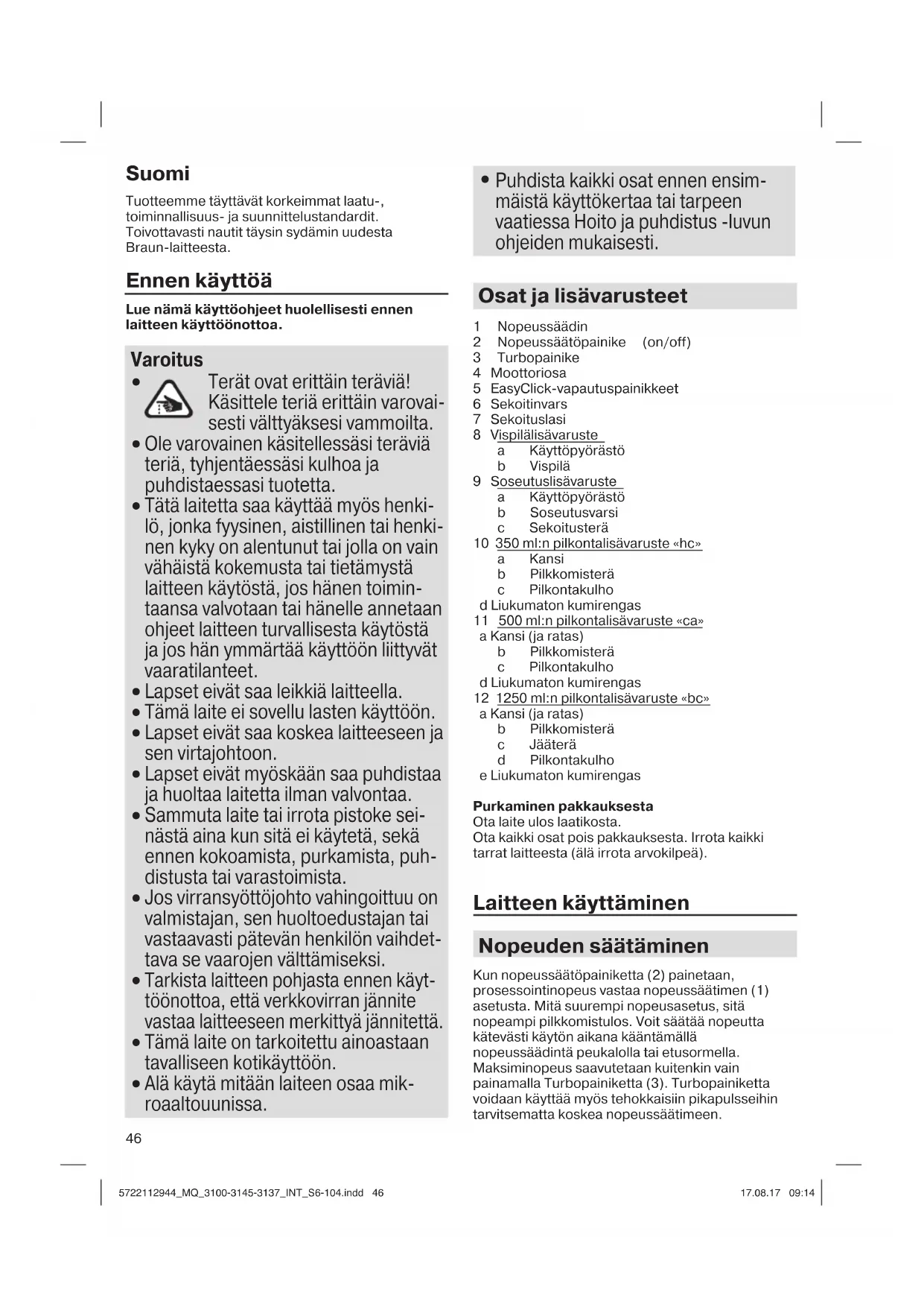 - Kun prosessoidaan ruokaa, joka sisältää paljon pigmenttiä (esim. porkkanoita), lisävaruste 5722112944_MQ_3100-3145-3137_INT_S6-104.indd 485722112944_MQ_3100-3145-3137_INT_S6-104.indd 48 17.08.17 09:1417.08.17 09:1449 saattaa värittyä. Pyyhi nämä osat vihannesöljyllä ennen puhdistamista. Sekä mallin tietoja että näitä käyttöohjeita voidaan muuttaa ilman erillistä ilmoitusta. Älä hävitä tuotetta kotitalousjätteiden kanssa sen käyttöiän lopussa. Hävittäminen tapahtuu Braun-huollossa tai sopivassa keräyspis- teessä. Elintarvikkeiden kanssa kosketuksiin joutuvat materiaalit ja tarvikkeet vastaavat Euroopan yhteisön asetuksen 1935/2004 vaatimuksia. 5722112944_MQ_3100-3145-3137_INT_S6-104.indd 495722112944_MQ_3100-3145-3137_INT_S6-104.indd 49 17.08.17 09:1417.08.17 09:1450 Polski Nasze produkty zostały zaprojektowane tak, aby spełniać najwyższe standardy w zakresie jakości, funkcjonalności i wzornictwa. Mamy nadzieję, że nowy produkt firmy Braun spełni Państwa oczekiwania. Przed użyciem Przed użyciem urządzenia należy dokładnie i w całości przeczytać instrukcję obsługi. Uwaga