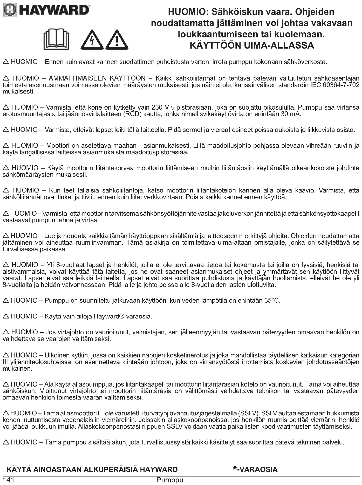 -VARAOSIA 142 Pumppu YLEISTÄ Olet tehnyt hyvän päätöksen ostaessasi Hayward