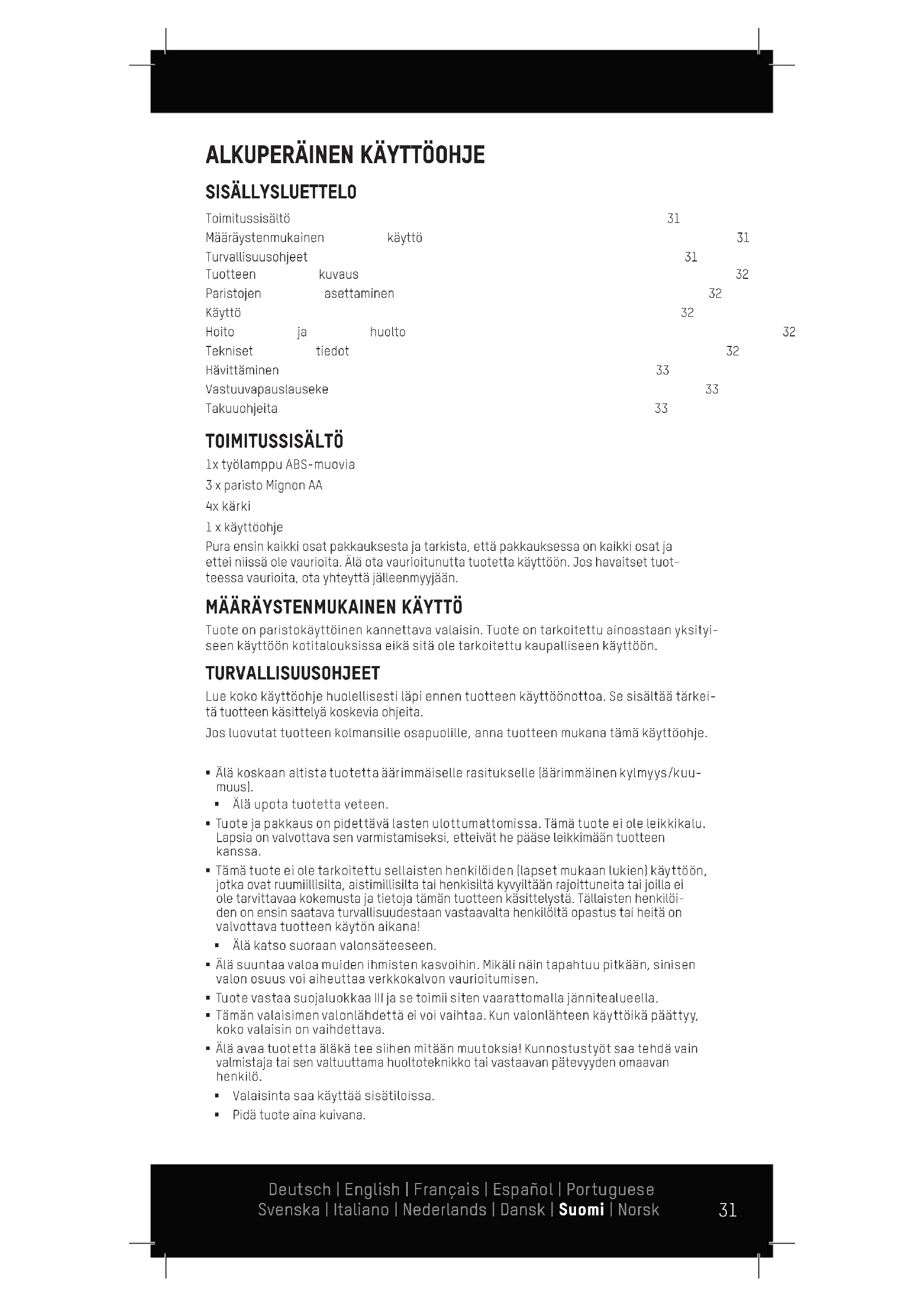 Tuote on paristokäyttöinen kannettava valaisin. Tuote on tarkoitettu ainoastaan yksityi- seen käyttöön kotitalouksissa eikä sitä ole tarkoitettu kaupalliseen käyttöön. TURVALLISUUSOHJEET Lue koko käyttöohje huolellisesti läpi ennen tuotteen käyttöönottoa. Se sisältää tärkei- tä tuotteen käsittelyä koskevia ohjeita. Jos luovutat tuotteen kolmansille osapuolille, anna tuotteen mukana tämä käyttöohje. § Älä koskaan altista tuotetta äärimmäiselle rasitukselle (äärimmäinen kylmyys/kuu- muus). § Älä upota tuotetta veteen. § Tuote ja pakkaus on pidettävä lasten ulottumattomissa. Tämä tuote ei ole leikkikalu. Lapsia on valvottava sen varmistamiseksi, etteivät he pääse leikkimään tuotteen kanssa. § Tämä tuote ei ole tarkoitettu sellaisten henkilöiden (lapset mukaan lukien) käyttöön, jotka ovat ruumiillisilta, aistimillisilta tai henkisiltä kyvyiltään rajoittuneita tai joilla ei ole tarvittavaa kokemusta ja tietoja tämän tuotteen käsittelystä. Tällaisten henkilöi- den on ensin saatava turvallisuudestaan vastaavalta henkilöltä opastus tai heitä on valvottava tuotteen käytön aikana! § Älä katso suoraan valonsäteeseen. § Älä suuntaa valoa muiden ihmisten kasvoihin. Mikäli näin tapahtuu pitkään, sinisen valon osuus voi aiheuttaa verkkokalvon vaurioitumisen. § Tuote vastaa suojaluokkaa III ja se toimii siten vaarattomalla jännitealueella. § Tämän valaisimen valonlähdettä ei voi vaihtaa. Kun valonlähteen käyttöikä päättyy, koko valaisin on vaihdettava. § Älä avaa tuotetta äläkä tee siihen mitään muutoksia! Kunnostustyöt saa tehdä vain valmistaja tai sen valtuuttama huoltoteknikko tai vastaavan pätevyyden omaavan henkilö. § Valaisinta saa käyttää sisätiloissa. § Pidä tuote aina kuivana. Toimitussisältö 31 Määräystenmukainen käyttö 31 Turvallisuusohjeet 31 Tuotteen kuvaus 32 Paristojen asettaminen 32 Käyttö 32 Hoito ja huolto 32 Tekniset tiedot 32 Hävittäminen 33 Vastuuvapauslauseke 33 Takuuohjeita 33 Deutsch | English | Français | Español | Portuguese Svenska | Italiano | Nederlands | Dansk | Suomi | Norsk32 Varoitus § Tämä tuote sisältää paristot. Älä polta tuotetta. § Epäasianmukaisesti käytettyinä paristot voivat vuotaa ja/tai aiheuttaa tulipalon/ räjähdyksen. § Vaihda aina kaikki paristot kerralla ja käytä samanarvoisia paristoja. § Pidä paristot lasten ulottumattomissa > nielemis- ja tukehtumisvaara. § Älä koskaan yritä avata, rutistaa, kuumentaa tai polttaa paristoa. § Älä käytä paristoja, jos tuote vaikuttaa vaurioituneelta. § Paristot eivät ole uudelleenladattavia! § Hävitä käytetyt paristot/akut aina paikallisten lakien tai vaatimusten mukaisesti. § Jos paristot ovat vuotaneet, älä koske niihin. Jos joudut kosketuksiin paristohapon kanssa, pese altistunut kohta välittömästi runsaalla määrällä vettä. § Jos paristohappo aiheuttaa ihoreaktion tai sitä joutuu silmiin, käänny välittömästi lääkärin puoleen. § Älä oikosulje paristoja! § Poista käytetyt tai tyhjät paristot välittömästi valaisimesta. § Jos valaisinta ei voi enää käyttää, paristot on poistettava valaisimesta ennen valaisi- men hävittämistä. TUOTTEEN KUVAUS (KATSO SIVU 2) 1 Virtapainike 2 COB-LED 3 Kärjet 4 Ripustuskoukku 5 Pitomagneetti 6 Paristolokero PARISTOJEN ASETTAMINEN Tuotteen mukana tulee 3 paristoa. Tuotteen käyttöönottoa varten avaa paristolokero ja aseta paristot navat oikein päin sisään. Kun vaihdat paristot, varmista ehdottomasti, että navat tulevat oikein päin. KÄYTTÖ 1 painallus: 100 % 2 painallusta: 50 % 3 painallusta: sammutus Työlampun voi ripustaa ripustuskoukusta sopiviin kiinnityskohtiin. Lampun taustapuolessa olevalla magneetilla tuotteen voi kiinnittää useimpiin magnet- oituviin pintoihin.