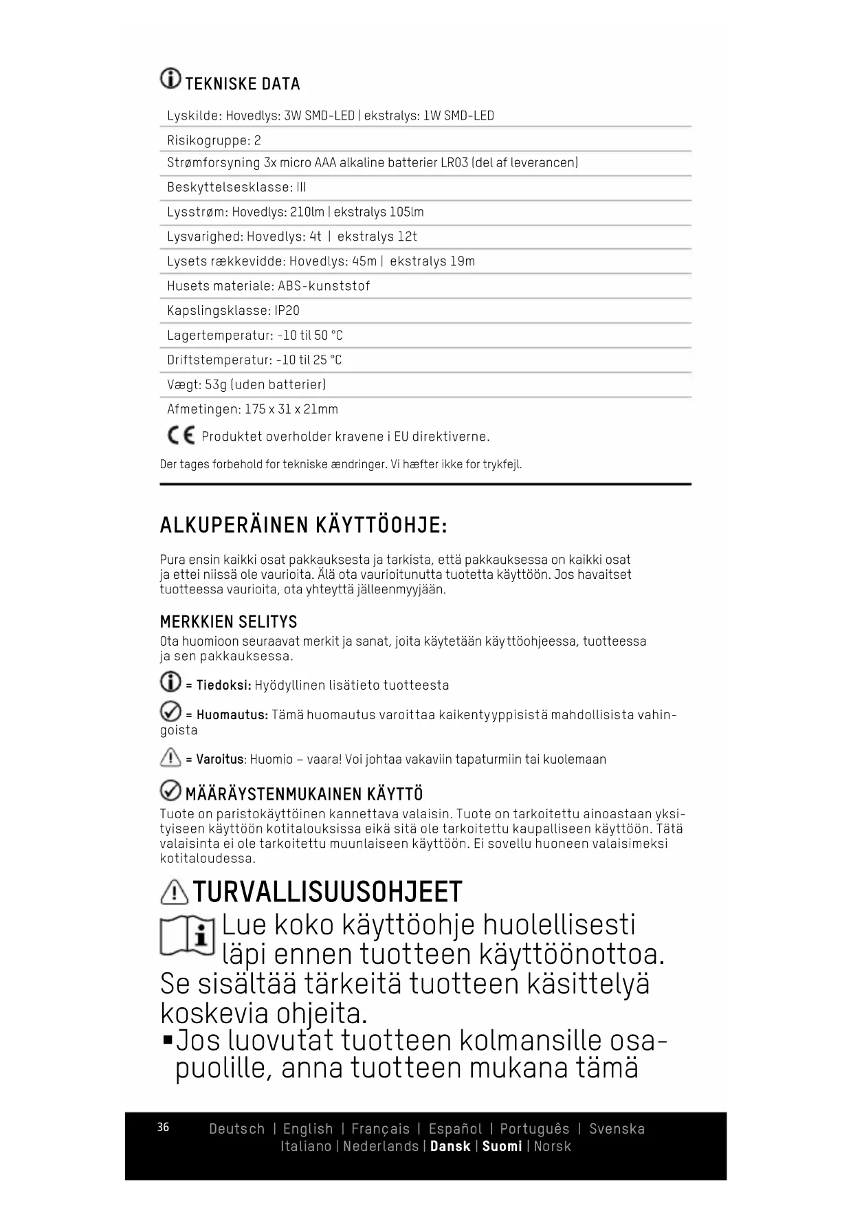 Tuote on paristokäyttöinen kannettava valaisin. Tuote on tarkoitettu ainoastaan yksi- tyiseen käyttöön kotitalouksissa eikä sitä ole tarkoitettu kaupalliseen käyttöön. Tätä valaisinta ei ole tarkoitettu muunlaiseen käyttöön. Ei sovellu huoneen valaisimeksi kotitaloudessa. TURVALLISUUSOHJEET Lue koko käyttöohje huolellisesti läpi ennen tuotteen käyttöönottoa. Se sisältää tärkeitä tuotteen käsittelyä koskevia ohjeita. §Jos luovutat tuotteen kolmansille osa- puolille, anna tuotteen mukana tämä Deutsch | English | Français | Español | Português | Svenska Italiano | Nederlands | Dans k | Suomi | Norsk37 Deutsch | English | Français | Español | Português | Svenska Italiano | Nederlands | Dansk | Suomi | Norsk käyttöohje. §Älä koskaan altista tuotetta äärimmäi- selle rasitukselle (äärimmäinen kylmy- ys/kuumuus). §Älä upota tuotetta veteen. §Tuote ja pakkaus on pidettävä lasten ulottumattomissa. Tämä tuote ei ole leikkikalu. Lapsia on valvottava sen var- mistamiseksi, etteivät he pääse leikki- mään tuotteen kanssa. §Tämä tuote ei ole tarkoitettu sellaisten henkilöiden (lapset mukaan lukien) käyt- töön, jotka ovat ruumiillisilta, aistimilli- silta tai henkisiltä kyvyiltään rajoittunei- ta tai joilla ei ole tarvittavaa kokemusta ja tietoja tämän tuotteen käsittelystä. Tällaisten henkilöiden on ensin saatava turvallisuudestaan vastaavalta henkilöl- tä opastus tai heitä on valvottava tuot- teen käytön aikana!