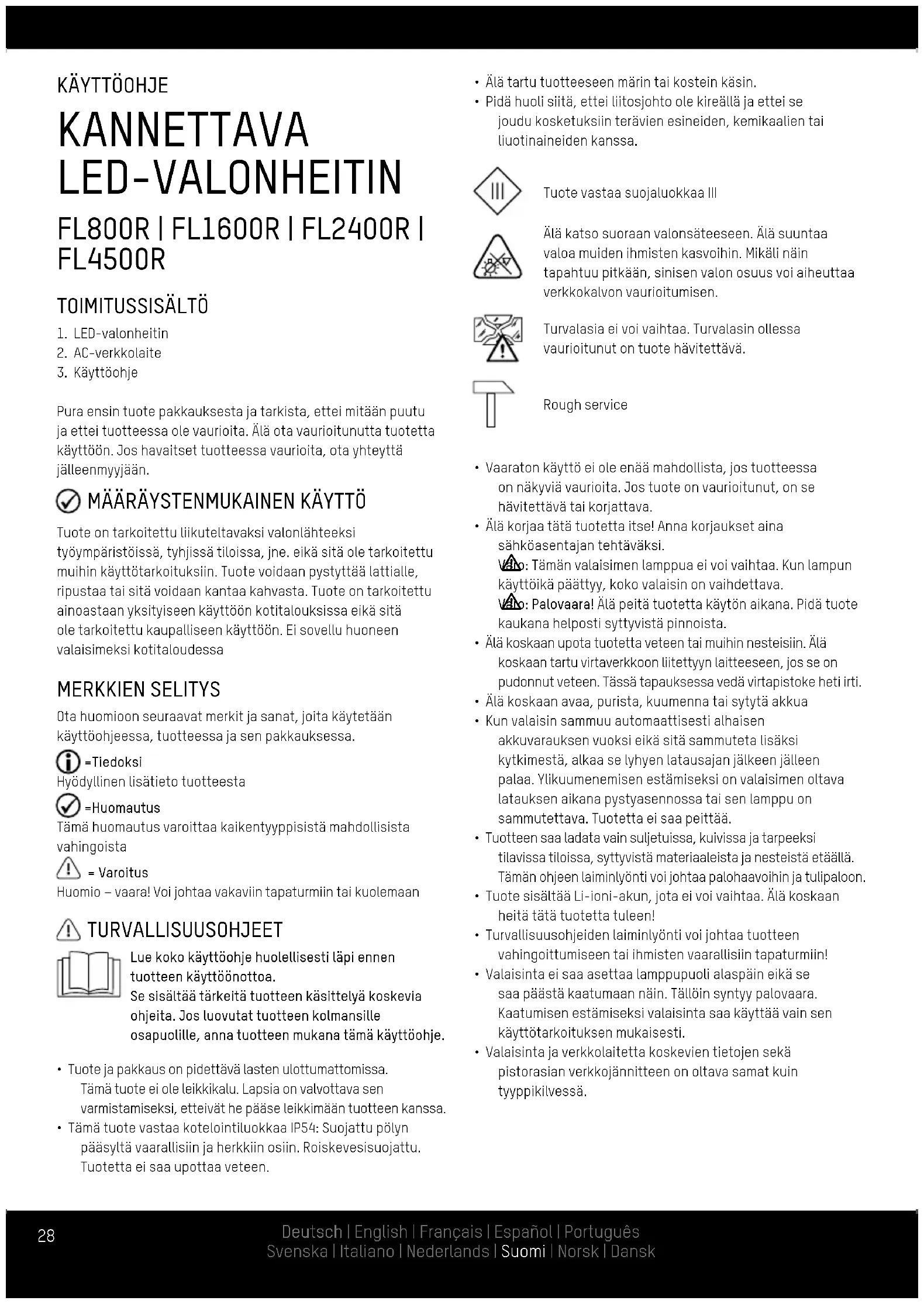 - Pidä huoli siitä, ettei liitosjohto ole kireällä ja ettei se joudu kosketuksiin terävien esineiden, kemikaalien tai liuotinaineiden kanssa. Tuote vastaa suojaluokkaa III Älä katso suoraan valonsäteeseen. Älä suuntaa valoa muiden ihmisten kasvoihin. Mikäli näin tapahtuu pitkään, sinisen valon osuus voi aiheuttaa verkkokalvon vaurioitumisen. Turvalasia ei voi vaihtaa. Turvalasin ollessa vaurioitunut on tuote hävitettävä. Rough service