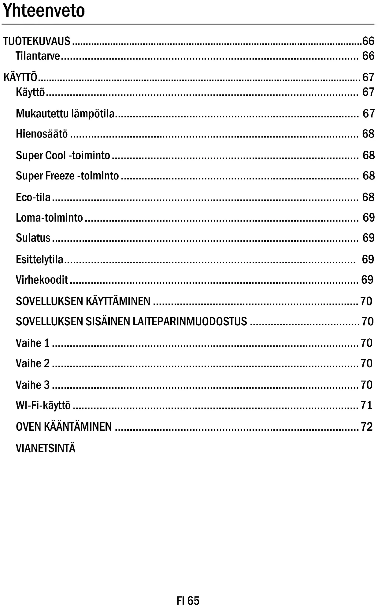 - Loma-toiminto päättyy automaattisesti, kun ohjauspaneelista valitaan toinen toiminto. Sulatus Jääkaappi- ja pakastinosasto sulatetaan automaattisesti, manuaalinen sulatus ei ole tarpeen. Slider Kasviskaupan lähellä on liukusäädin, jonka avulla voit säätää sen kosteutta: sen siirtäminen oikealle vähentää kosteutta, sen siirtäminen vasemmalle lisää kosteutta. Esittelytila Pidä ovea auki ja paina on/off-painiketta sekä paina SET-painiketta 5 kertaa. Jääkaappi siirtyy Esittelytilaan. Poistu tilasta pitämällä ovikytkintä painettuna ja painamalla SET-painiketta uudelleen 5 sekunnin ajan. Virhekoodit Jos 6 °C -LED-merkkivalot vilkkuvat samanaikaisesti, kyseessä on tuuletinvirhe. Ota yhteyttä tekniseen tukeen ongelman ratkaisemiseksiFI 70