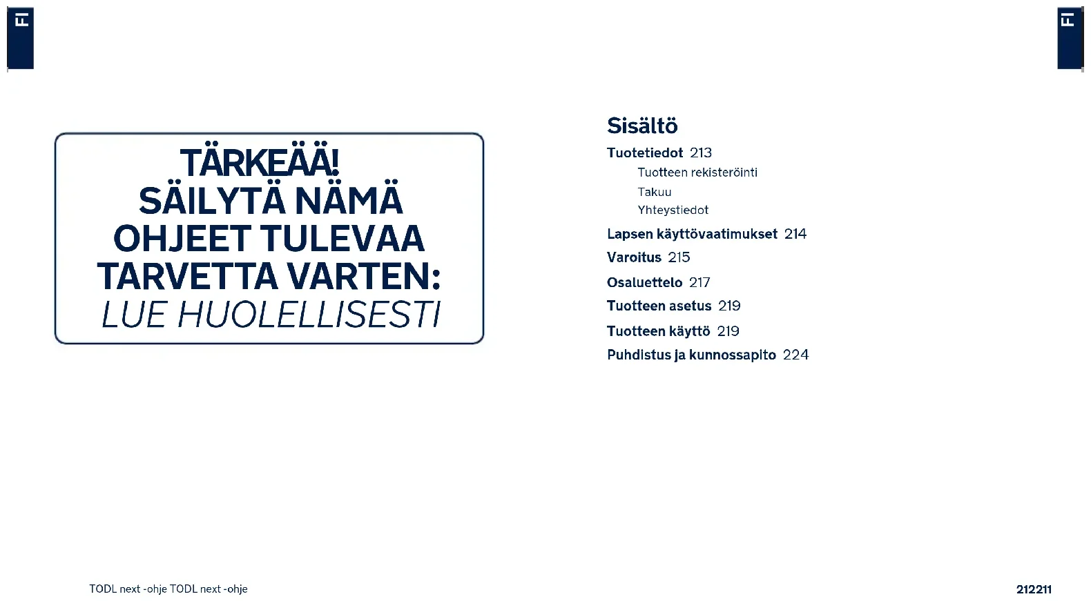 Sisältö Tuotetiedot 213 Tuotteen rekisteröinti Takuu Yhteystiedot Lapsen käyttövaatimukset 214 Varoitus 215 Osaluettelo 217 Tuotteen asetus 219 Tuotteen käyttö 219 Puhdistus ja kunnossapito 224 TÄRKEÄÄ!