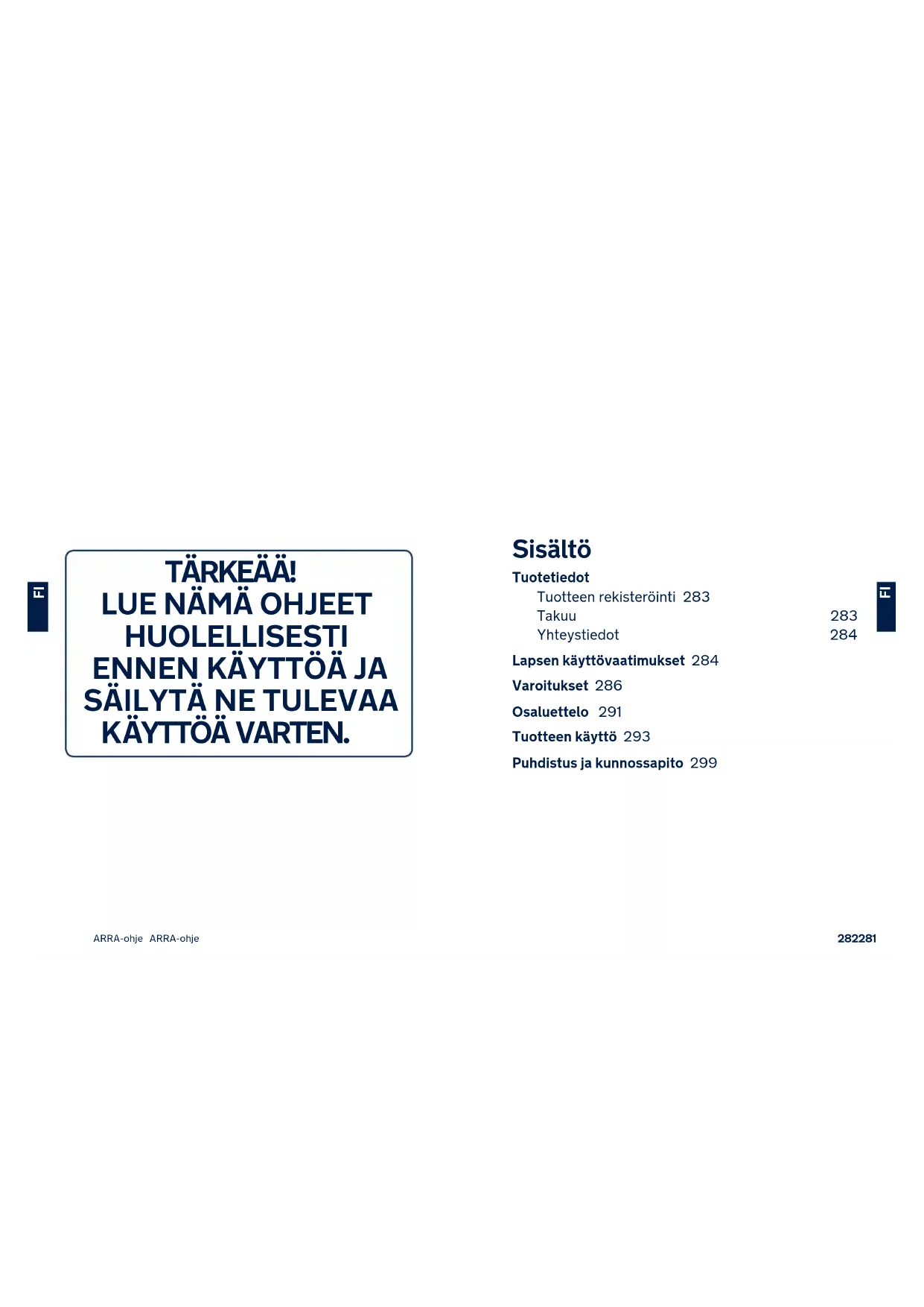 Sisältö Tuotetiedot Tuotteen rekisteröinti 283 Takuu 283 Yhteystiedot 284 Lapsen käyttövaatimukset 284 Varoitukset 286 Osaluettelo 291 Tuotteen käyttö 293 Puhdistus ja kunnossapito 299 TÄRKEÄÄ﹗