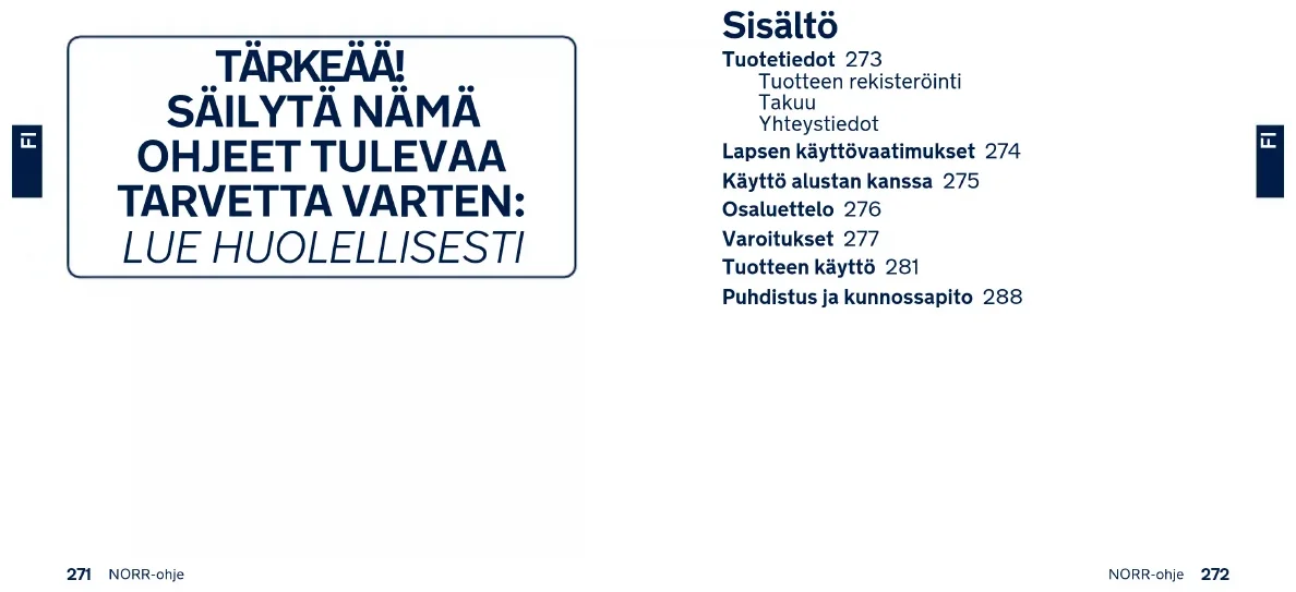 SVSisältö Tuotetiedot 273 Tuotteen rekisteröinti Takuu Yhteystiedot Lapsen käyttövaatimukset 274 Käyttö alustan kanssa 275 Osaluettelo 276 Varoitukset 277 Tuotteen käyttö 281 Puhdistus ja kunnossapito 288 TÄRKEÄÄ!