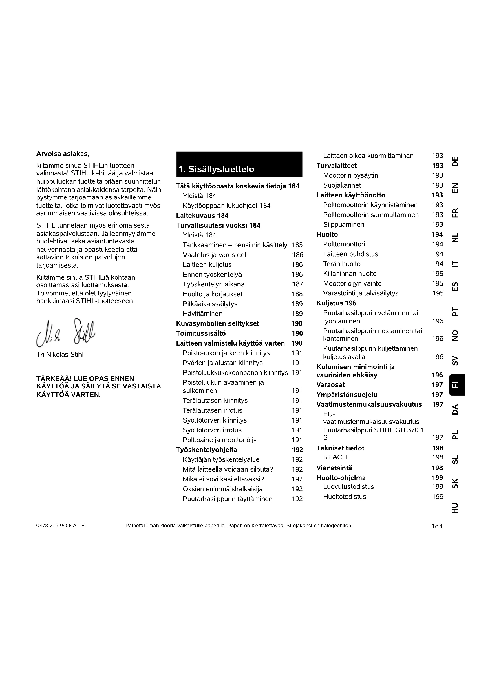 Tätä käyttöopasta koskevia tietoja 184 Yleistä 184 Käyttöoppaan lukuohjeet 184 Laitekuvaus 184 Turvallisuutesi vuoksi 184 Yleistä 184 Tankkaaminen – bensiinin käsittely 185 Vaatetus ja varusteet 186 Laitteen kuljetus 186 Ennen työskentelyä 186 Työskentelyn aikana 187 Huolto ja korjaukset 188 Pitkäaikaissäilytys 189 Hävittäminen 189 Kuvasymbolien selitykset 190 Toimitussisältö 190 Laitteen valmistelu käyttöä varten 190 Poistoaukon jatkeen kiinnitys 191 Pyörien ja alustan kiinnitys 191 Poistoluukkukokoonpanon kiinnitys 191 Poistoluukun avaaminen ja sulkeminen 191 Terälautasen kiinnitys 191 Terälautasen irrotus 191 Syöttötorven kiinnitys 191 Syöttötorven irrotus 191 Polttoaine ja moottoriöljy 191 Työskentelyohjeita 192 Käyttäjän työskentelyalue 192 Mitä laitteella voidaan silputa? 192 Mikä ei sovi käsiteltäväksi? 192 Oksien enimmäishalkaisija 192 Puutarhasilppurin täyttäminen 192 Laitteen oikea kuormittaminen 193 Turvalaitteet 193 Moottorin pysäytin 193 Suojakannet 193 Laitteen käyttöönotto 193 Polttomoottorin käynnistäminen 193 Polttomoottorin sammuttaminen 193 Silppuaminen 193 Huolto 194 Polttomoottori 194 Laitteen puhdistus 194 Terän huolto 194 Kiilahihnan huolto 195 Moottoriöljyn vaihto 195 Varastointi ja talvisäilytys 195 Kuljetus 196 Puutarhasilppurin vetäminen tai työntäminen 196 Puutarhasilppurin nostaminen tai kantaminen 196 Puutarhasilppurin kuljettaminen kuljetuslavalla 196 Kulumisen minimointi ja vaurioiden ehkäisy 196 Varaosat 197 Ympäristönsuojelu 197 Vaatimustenmukaisuusvakuutus 197 EU- vaatimustenmukaisuusvakuutus Puutarhasilppuri STIHL GH 370.1 S197 Tekniset tiedot 198 REACH 198 Vianetsintä 198 Huolto-ohjelma 199 Luovutustodistus 199 Huoltotodistus 1990478 216 9908 A - FI