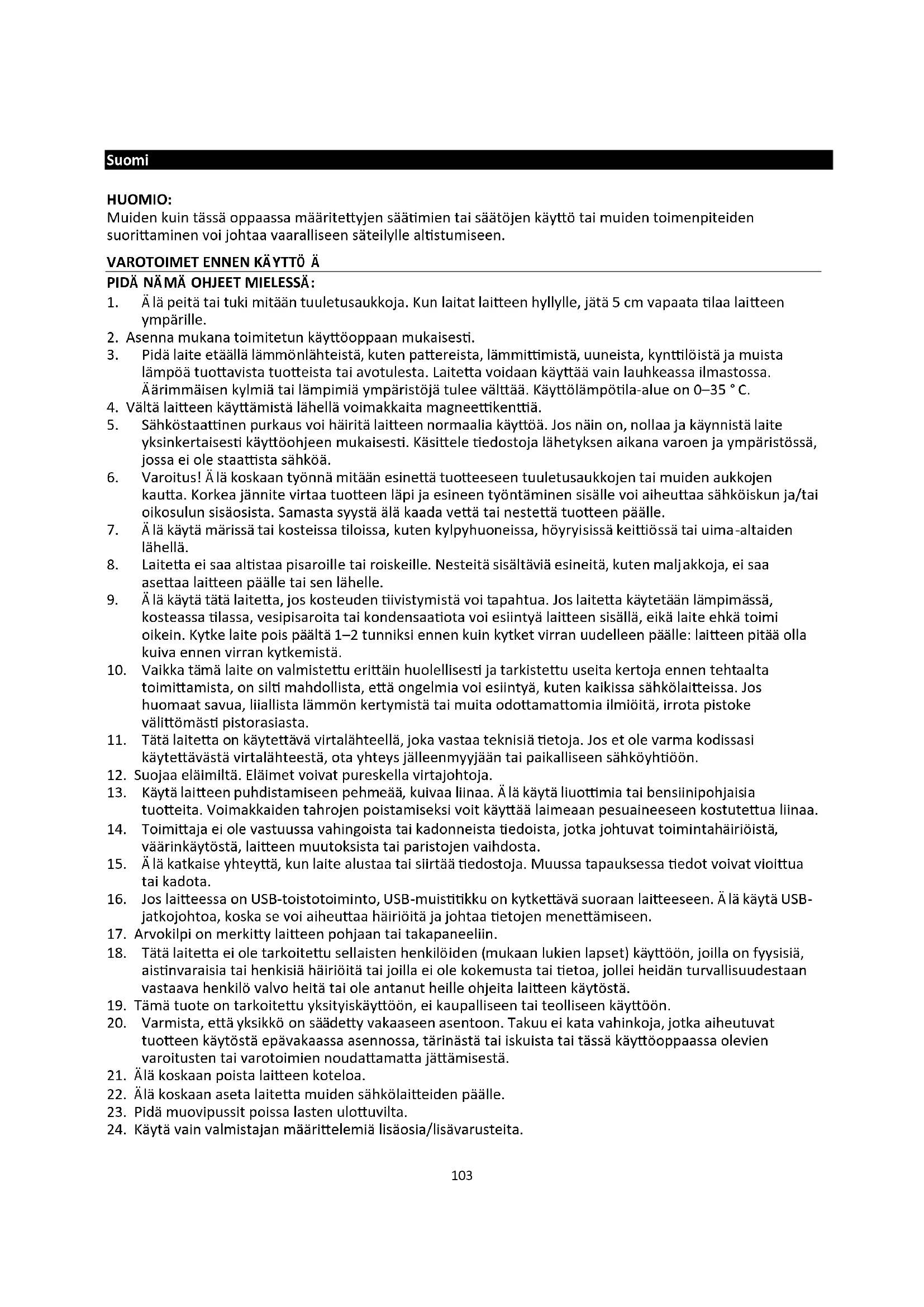 16. Jos laitteessa on USB-toistotoiminto, USB-muistitikku on kytkettävä suoraan laitteeseen. Älä käytä USB-