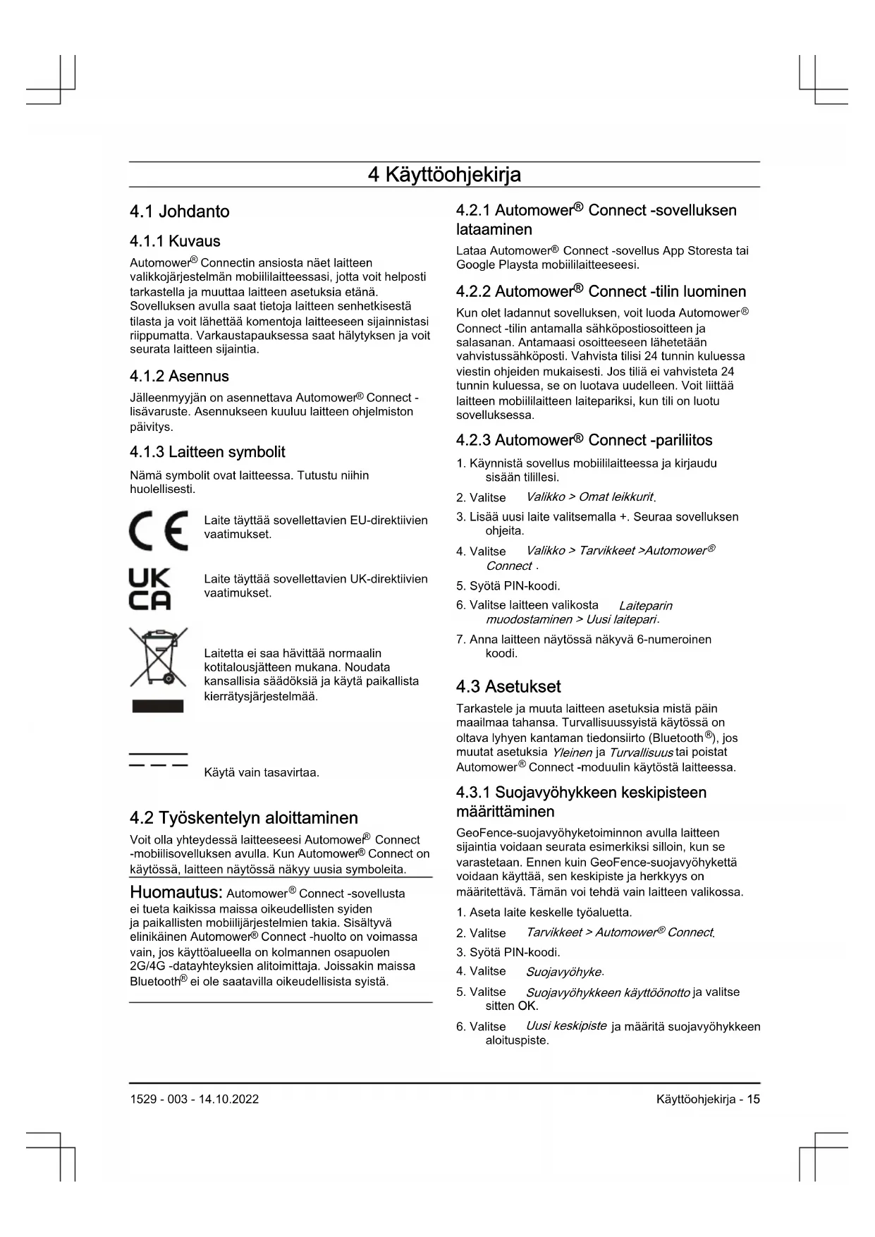 Voit olla yhteydessä laitteeseesi Automower Connect-mobiilisovelluksen avulla. Kun Automower Connect onkäytössä, laitteen näytössä näkyy uusia symboleita. Huomautus: Automower Connect -sovellustaei tueta kaikissa maissa oikeudellisten syidenja paikallisten mobiilijärjestelmien takia. Sisältyväelinikäinen Automower Connect -huolto on voimassavain, jos käyttöalueella on kolmannen osapuolen2G/4G -datayhteyksien alitoimittaja. Joissakin maissaBluetooth ei ole saatavilla oikeudellisista syistä.