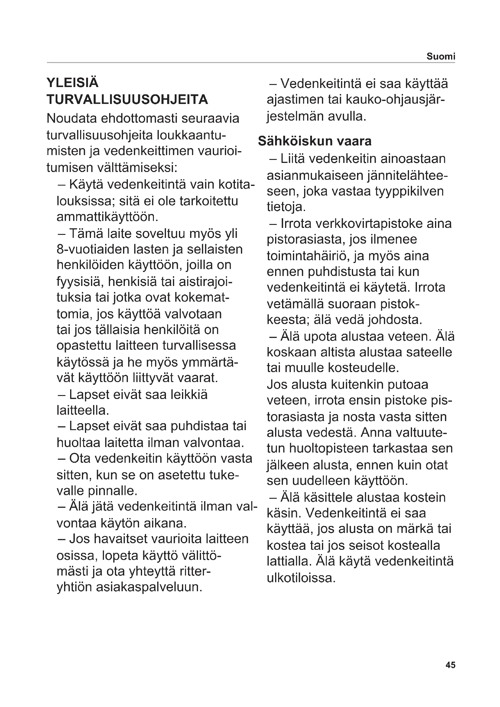 Símbolo Explicación Marcado CE: Este producto es conforme con los requisitos actuales de la unión Europea. Este producto se ha comercializado después del 13 de agosto de 2005. No se puede desechar con la basura doméstica. El símbolo del contenedor de basura tachado indica la necesidad de una recogida selectiva. Apto para el contacto con alimentos Dispositivo con clase de protección I45 Suomi YLEISIÄ TURVALLISUUSOHJEITA Noudata ehdottomasti seuraavia turvallisuusohjeita loukkaantu- misten ja vedenkeittimen vaurioi- tumisen välttämiseksi: – Käytä vedenkeitintä vain kotita- louksissa; sitä ei ole tarkoitettu ammattikäyttöön. – Tämä laite soveltuu myös yli 8-vuotiaiden lasten ja sellaisten henkilöiden käyttöön, joilla on fyysisiä, henkisiä tai aistirajoi- tuksia tai jotka ovat kokemat- tomia, jos käyttöä valvotaan tai jos tällaisia henkilöitä on opastettu laitteen turvallisessa käytössä ja he myös ymmärtä- vät käyttöön liittyvät vaarat. – Lapset eivät saa leikkiä laitteella. – Lapset eivät saa puhdistaa tai huoltaa laitetta ilman valvontaa. – Ota vedenkeitin käyttöön vasta sitten, kun se on asetettu tuke- valle pinnalle. – Älä jätä vedenkeitintä ilman val- vontaa käytön aikana. – Jos havaitset vaurioita laitteen osissa, lopeta käyttö välittö- mästi ja ota yhteyttä ritter- yhtiön asiakaspalveluun. – Vedenkeitintä ei saa käyttää ajastimen tai kauko-ohjausjär- jestelmän avulla. Sähköiskun vaara – Liitä vedenkeitin ainoastaan asianmukaiseen jännitelähtee- seen, joka vastaa tyyppikilven tietoja. – Irrota verkkovirtapistoke aina pistorasiasta, jos ilmenee toimintahäiriö, ja myös aina ennen puhdistusta tai kun vedenkeitintä ei käytetä. Irrota vetämällä suoraan pistok- keesta; älä vedä johdosta. – Älä upota alustaa veteen. Älä koskaan altista alustaa sateelle tai muulle kosteudelle. Jos alusta kuitenkin putoaa veteen, irrota ensin pistoke pis- torasiasta ja nosta vasta sitten alusta vedestä. Anna valtuute- tun huoltopisteen tarkastaa sen jälkeen alusta, ennen kuin otat sen uudelleen käyttöön. – Älä käsittele alustaa kostein käsin. Vedenkeitintä ei saa käyttää, jos alusta on märkä tai kostea tai jos seisot kostealla lattialla. Älä käytä vedenkeitintä ulkotiloissa.46 Suomi – Pyyhi ylivuotanut tai tiivistynyt vesi aina saman tien pois. Vedä sitä ennen aina pistoke irti pistorasiasta. – Älä täytä vesikannua sen seistessä alustalla, sillä vesi- roiskeet voivat aiheuttaa sähköiskun. – Käytä vedenkeitintä vain, jos verkkovirtajohdossa, alustassa ja vesikannussa ei ole mitään näkyviä vaurioita. Jos verk- kovirtajohto on vaurioitunut, valmistajan tai valmistajan asia- kaspalvelun tai vastaavan päte- vän henkilön on vaihdettava se, jotta vältetään vaaratilanteet. – Älä koskaan sorki alustaa metalliesineillä. – Käytä vedenkeitintä ainoastaan siihen kuuluvan alustan kanssa (tyyppi fontana