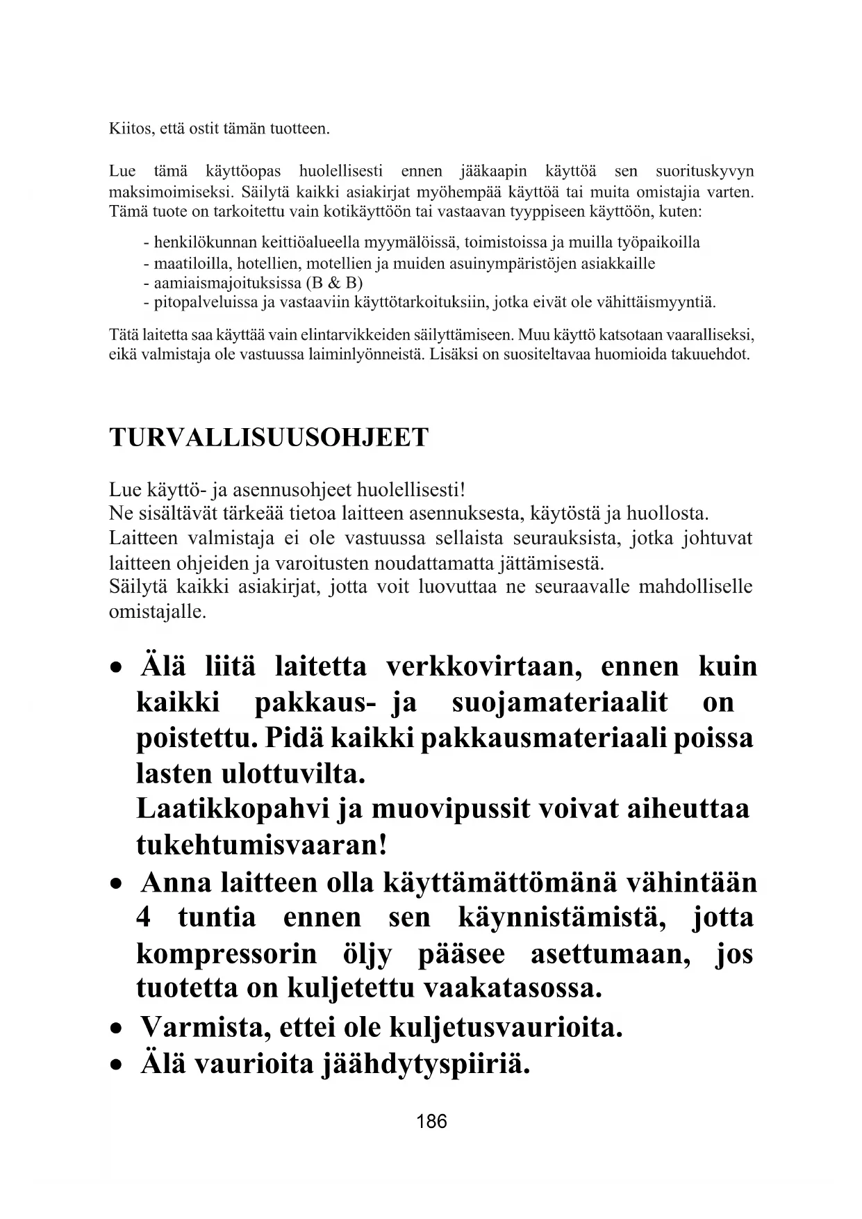 Kiitos, että ostit tämän tuotteen. Lue tämä käyttöopas huolellisesti ennen jääkaapin käyttöä sen suorituskyvyn maksimoimiseksi. Säilytä kaikki asiakirjat myöhempää käyttöä tai muita omistajia varten. Tämä tuote on tarkoitettu vain kotikäyttöön tai vastaavan tyyppiseen käyttöön, kuten: - henkilökunnan keittiöalueella myymälöissä, toimistoissa ja muilla työpaikoilla - maatiloilla, hotellien, motellien ja muiden asuinympäristöjen asiakkaille - aamiaismajoituksissa (B & B) - pitopalveluissa ja vastaaviin käyttötarkoituksiin, jotka eivät ole vähittäismyyntiä. Tätä laitetta saa käyttää vain elintarvikkeiden säilyttämiseen. Muu käyttö katsotaan vaaralliseksi, eikä valmistaja ole vastuussa laiminlyönneistä. Lisäksi on suositeltavaa huomioida takuuehdot. TURVALLISUUSOHJEET Lue käyttö- ja asennusohjeet huolellisesti! Ne sisältävät tärkeää tietoa laitteen asennuksesta, käytöstä ja huollosta. Laitteen valmistaja ei ole vastuussa sellaista seurauksista, jotka johtuvat laitteen ohjeiden ja varoitusten noudattamatta jättämisestä. Säilytä kaikki asiakirjat, jotta voit luovuttaa ne seuraavalle mahdolliselle omistajalle.