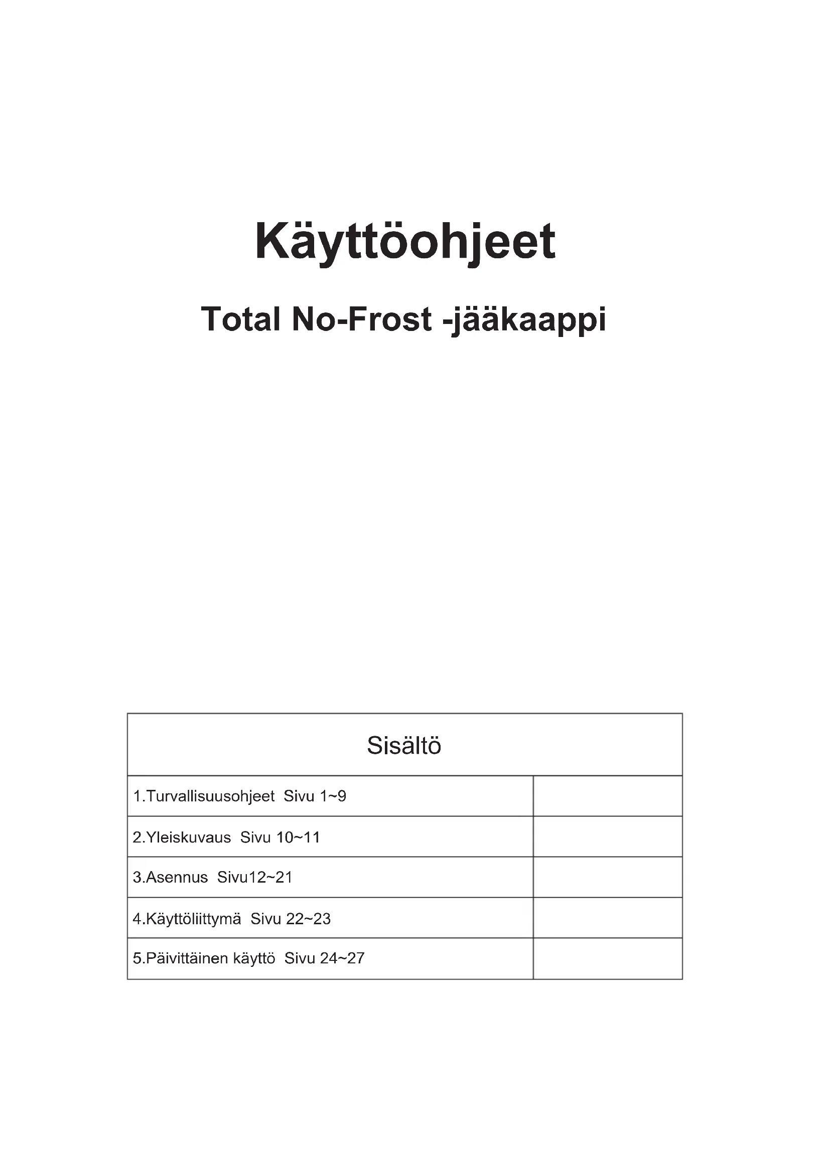 Para ayudarle a configurar su frigorífico correctamente, este está equipado con un indicador de temperatura que monitorizará la temperatura media en la parte más fría. ADVERTENCIA: Este indicador solo está diseñado para su uso con su frigorífico. Asegúrese de no usarlo en otro frigorífico (la zona más fría difiere), o para cualquier otro uso. Comprobar la temperatura en el área más fría. Una vez instalado el indicador de temperatura, puede comprobar regularmente que la temperatura en la zona más fría es correcta. Si es necesario, ajuste el termostato conforme a lo descrito anteriormente. La temperatura del interior del frigorífico está influenciada por varios factores, como la temperatura ambiente, la cantidad de alimentos almacenados y con qué frecuencia se abre la puerta. Tenga en cuenta estos factores al ajustar la temperatura. Para asegurarse de que los alimentos de su frigorífico estén bien conservados, especialmente en la parte más fría, asegúrese de que el indicador de temperatura muestre ‘OK’. Si no aparece ‘OK’, la temperatura en esa parte es demasiado alta. Ajuste el termostato a una posición más alta. Espere al menos 12 horas antes de volver a ajustar el termostato. Después de colocar alimentos frescos dentro del aparato o después de la apertura repetida (o prolongada) de la puerta, es normal que la indicación ‘OK’ no se muestre en el indicador de temperatura. 28Käyttöohjeet Total No-Frost -jääkaappi Sisältö 1.Turvallisuusohjeet Sivu 1~9 2.Yleiskuvaus Sivu 10~11 3.Asennus Sivu12~21 4.Käyttöliittymä Sivu 22~23 5.Päivittäinen käyttö Sivu 24~271 Kiitos, että ostit tämän tuotteen. Lue tämä käyttöopas huolellisesti ennen jääkaapin käyttöä sen suorituskyvyn maksimoimiseksi. Säilytä kaikki asiakirjat myöhempää käyttöä tai muita omistajia varten. Tämä tuote on tarkoitettu vain kotikäyttöön tai vastaavan tyyppiseen käyttöön, kuten: - henkilökunnan keittiöalueella myymälöissä, toimistoissa ja muilla työpaikoilla - maatiloilla, hotellien, motellien ja muiden asuinympäristöjen asiakkaille - aamiaismajoituksissa (B & B) - pitopalveluissa ja vastaaviin käyttötarkoituksiin, jotka eivät ole vähittäismyyntiä. Tätä laitetta saa käyttää vain elintarvikkeiden säilyttämiseen. Muu käyttö katsotaan vaaralliseksi, eikä valmistaja ole vastuussa laiminlyönneistä. Lisäksi on suositeltavaa huomioida takuuehdot. TURVALLISUUSOHJEET Lue käyttö- ja asennusohjeet huolellisesti! Ne sisältävät tärkeää tietoa laitteen asennuksesta, käytöstä ja huollosta. Laitteen valmistaja ei ole vastuussa sellaista seurauksista, jotka johtuvat laitteen ohjeiden ja varoitusten noudattamatta jättämisestä. Säilytä kaikki asiakirjat, jotta voit luovuttaa ne seuraavalle mahdolliselle omistajalle. x Älä liitä laitetta verkkovirtaan, ennen kuin kaikki pakkaus- ja suojamateriaalit on poistettu. Pidä kaikki pakkausmateriaali poissa lasten ulottuvilta. Laatikkopahvi ja muovipussit voivat aiheuttaa tukehtumisvaaran! x Anna laitteen olla käyttämättömänä vähintään 4 tuntia ennen sen käynnistämistä, jotta kompressorin öljy pääsee asettumaan, jos tuotetta on kuljetettu vaakatasossa. x Varmista, ettei ole kuljetusvaurioita. x Älä vaurioita jäähdytyspiiriä.2 x Pidä laitteen kotelon tai rakenteelliset tuuletusaukot vapaina esteistä. x Älä koskaan pese kompressorin paikkaa vedellä. Pyyhi se kuivalla liinalla huolellisesti puhdistuksen jälkeen ruostumisen estämiseksi. x Laite on painava ja sen vuoksi sen käsittelemiseen tarvitaan aina vähintään kaksi henkilöä. x Asenna ja säädä laitteen jalkoja tarpeen mukaan niin että laite on tasapainossa ja tasaisesti. Asennuspaikan on oltava sopivan kokoinen ja sovelluttava laitteen käyttötarkoitukseen. x Varmista, että laitteen arvokilvessä ilmoitetut sähkötiedot vastaavat käytettävissä olevaa virransyöttöä. Jos näin ei ole, ota yhteyttä sähköasentajaan. x Verkkoliitäntä: 220–240 V, 50 Hz Epänormaali jännitevaihtelu voi estää laitteen käynnistymisen tai vaurioittaa lämpötilan säätöä tai kompressoria tai aiheuttaa epänormaalia käyntiääntä. Tässä tapauksessa laitteeseen on asennettava automaattinen jännitteensäädin. x Vain Iso-Britannia: Laitteen virtajohtoon on liitetty 3-haarainen (maadoitettu) pistoke, joka sopii 3-haaraiseen (maadoitettuun) pistorasiaan. Kolmatta tappia (maadoitus) ei koskaan saa leikata pois tai poistaa jollakin muulla tavalla. Pistoke tulisi olla käytettävissä laitteen asennuksen jälkeen. x Varmista, että virtajohto ei ole jäänyt laitteen alle kuljetuksen tai siirron aikana tai sen jälkeen, koska tämä voisi aiheuttaa virtajohdon katkeamisen tai vahingoittumisen. Jos virtajohto3 on vaurioitunut, valmistajan, sen huoltoedustajan tai vastaavan ammattitaitoisen henkilön on vaihdettava se vaaran välttämiseksi. x Älä asenna laitetta kosteaan, öljyiseen tai pölyiseen paikkaan äläkä altista laitetta suoralle auringonvalolle ja vedelle. x Älä asenna laitetta lämmittimien tai syttyvien materiaalien lähelle. x VAIN pakasteosan sisältävät laitteet: älä avaa ovea sähkökatkoksen aikana. Pakastettujen ruokien laadun ei pitäisi kärsiä, mikäli sähkökatkos kestää vähemmän kuin arvokilvessä ilmoitetun ajan (lämpötilan nousuaika). Jos sähkökatkos kestää kauemmin, ruokapakasteiden kunto tulisi tarkistaa ja ruoka tulisi syödä välittömästi tai se tulisi keittää ja pakastaa sitten uudelleen. x On aivan normaalia, jos laitteen oven avaaminen tuntuu vaikealta heti oven sulkemisen jälkeen. Tämä johtuu paine-erosta, joka tasaantuu hiljalleen. Oven avaaminen käy normaalisti muutaman minuutin kuluttua. x Älä säilytä laitteessa lääkkeitä, bakteereita tai kemiallisia aineita. Laite on kotitalouslaite eikä sitä ole tarkoitettu sellaisten tuotteiden säilytykseen, jotka vaativat tarkkoja säilytyslämpötiloja. x Älä vedä tai taita virtajohtoa tai