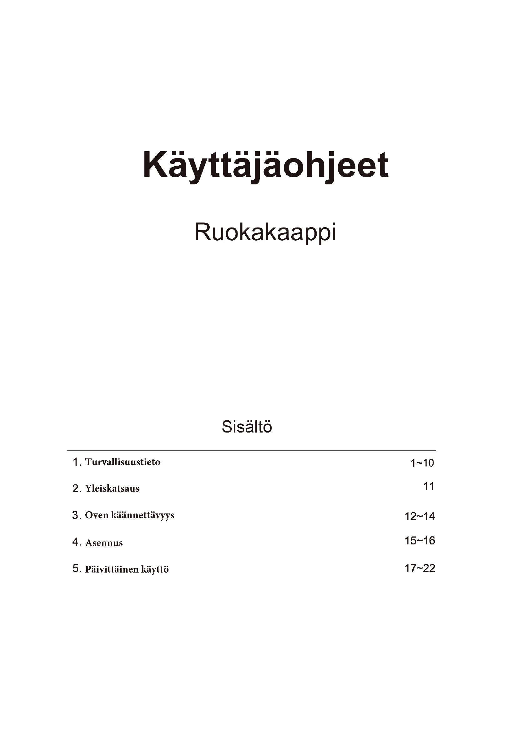 12~14 15~16 17~22 Käyttäjäohjeet RuokakaappiKiitos, että ostit tämän tuotteen. Lue tämä käyttöopas huolellisesti ennen jääkaapin käyttämistä, jotta sen suoritusteho olisi paras mahdollinen. Säilytä kaikki asiakirjat myöhempää käyttöä tai toisia omistajia varten. Tuote on tarkoitettu yksinomaan kotitalouskäyttöön ja vastaaviin tarkoituksiin, kuten: - henkilöstökeittiöt kaupoissa, toimistoissa ja muissa työympäristöissä - maatilat, hotellien, motellien ja muiden majatalojen asiakkaiden käyttöympäristöt - aamiaismajoitus (Bed & Breakfast) - pitopalvelut ja vastaavat, ei jälleenmyynti. Lai tetta saa käyttää vain elintarvikkeiden säilyttämiseen. Kaikki muu käyttö katsotaan vaaralliseksi, eikä valmistaja ole vastuussa mistään vaurioista. Suosittelemme myös kiinnittämään huomiota takuuehtoihin. TURVALLISUUSTIEDOT Lue käyttö- ja asennusohjeet huolellisesti! Ne sisältävät tärkeää tietoa laitteen asennuksesta, käytöstä ja ylläpidosta. Laitteen valmistaja ei ole vastuussa sellaista seurauksista, jotka aiheutuvat, jos et noudata laitteen ohjeita ja varoituksia. Säilytä kaikki asiakirjat, jotta voit luovuttaa ne seuraavalle mahdolliselle omistajalle.