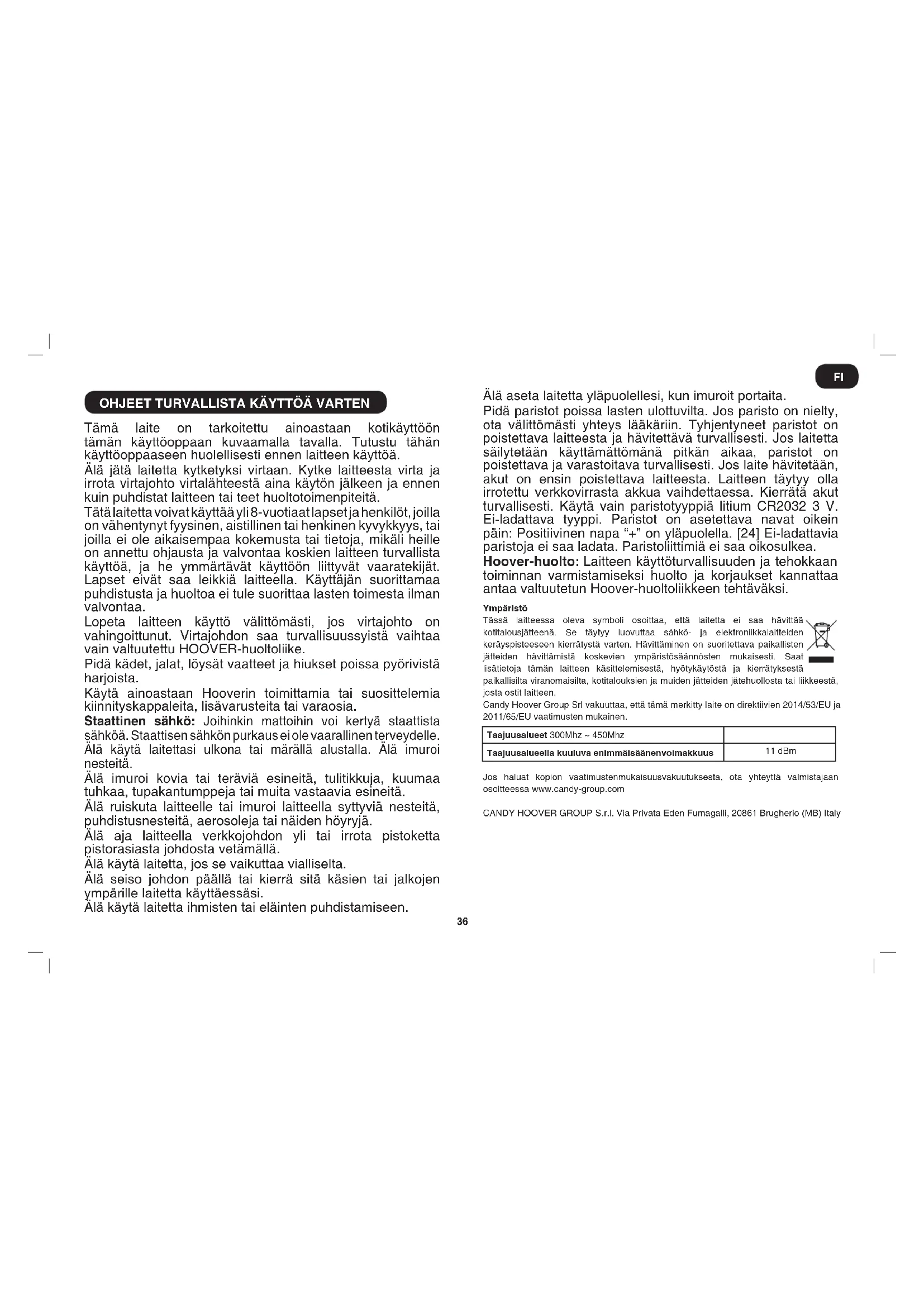 Tämä laite on tarkoitettu ainoastaan kotikäyttöön tämän käyttöoppaan kuvaamalla tavalla. Tutustu tähän käyttöoppaaseen huolellisesti ennen laitteen käyttöä. Älä jätä laitetta kytketyksi virtaan. Kytke laitteesta virta ja irrota virtajohto virtalähteestä aina käytön jälkeen ja ennen kuin puhdistat laitteen tai teet huoltotoimenpiteitä. Tätä laitetta voivat käyttää yli 8-vuotiaat lapset ja henkilöt, joilla on vähentynyt fyysinen, aistillinen tai henkinen kyvykkyys, tai joilla ei ole aikaisempaa kokemusta tai tietoja, mikäli heille on annettu ohjausta ja valvontaa koskien laitteen turvallista käyttöä, ja he ymmärtävät käyttöön liittyvät vaaratekijät. Lapset eivät saa leikkiä laitteella. Käyttäjän suorittamaa puhdistusta ja huoltoa ei tule suorittaa lasten toimesta ilman valvontaa. Lopeta laitteen käyttö välittömästi, jos virtajohto on vahingoittunut. Virtajohdon saa turvallisuussyistä vaihtaa vain valtuutettu HOOVER-huoltoliike. Pidä kädet, jalat, löysät vaatteet ja hiukset poissa pyörivistä harjoista. Käytä ainoastaan Hooverin toimittamia tai suosittelemia kiinnityskappaleita, lisävarusteita tai varaosia. Staattinen sähkö: Joihinkin mattoihin voi kertyä staattista sähköä. Staattisen sähkön purkaus ei ole vaarallinen terveydelle. Älä käytä laitettasi ulkona tai märällä alustalla. Älä imuroi nesteitä. Älä imuroi kovia tai teräviä esineitä, tulitikkuja, kuumaa tuhkaa, tupakantumppeja tai muita vastaavia esineitä. Älä ruiskuta laitteelle tai imuroi laitteella syttyviä nesteitä, puhdistusnesteitä, aerosoleja tai näiden höyryjä. Älä aja laitteella verkkojohdon yli tai irrota pistoketta pistorasiasta johdosta vetämällä. Älä käytä laitetta, jos se vaikuttaa vialliselta. Älä seiso johdon päällä tai kierrä sitä käsien tai jalkojen ympärille laitetta käyttäessäsi. Älä käytä laitetta ihmisten tai eläinten puhdistamiseen. Älä aseta laitetta yläpuolellesi, kun imuroit portaita. Pidä paristot poissa lasten ulottuvilta. Jos paristo on nielty, ota välittömästi yhteys lääkäriin. Tyhjentyneet paristot on poistettava laitteesta ja hävitettävä turvallisesti. Jos laitetta säilytetään käyttämättömänä pitkän aikaa, paristot on poistettava ja varastoitava turvallisesti. Jos laite hävitetään, akut on ensin poistettava laitteesta. Laitteen täytyy olla irrotettu verkkovirrasta akkua vaihdettaessa. Kierrätä akut turvallisesti. Käytä vain paristotyyppiä litium CR2032 3 V. Ei-ladattava tyyppi. Paristot on asetettava navat oikein päin: Positiivinen napa “+” on yläpuolella. [24] Ei-ladattavia paristoja ei saa ladata. Paristoliittimiä ei saa oikosulkea. Hoover-huolto: Laitteen käyttöturvallisuuden ja tehokkaan toiminnan varmistamiseksi huolto ja korjaukset kannattaa antaa valtuutetun Hoover-huoltoliikkeen tehtäväksi. Ympäristö Tässä laitteessa oleva symboli osoittaa, että laitetta ei saa hävittää kotitalousjätteenä. Se täytyy luovuttaa sähkö- ja elektroniikkalaitteiden keräyspisteeseen kierrätystä varten. Hävittäminen on suoritettava paikallisten jätteiden hävittämistä koskevien ympäristösäännösten mukaisesti. Saat lisätietoja tämän laitteen käsittelemisestä, hyötykäytöstä ja kierrätyksestä paikallisilta viranomaisilta, kotitalouksien ja muiden jätteiden jätehuollosta tai liikkeestä, josta ostit laitteen. Candy Hoover Group Srl vakuuttaa, että tämä merkitty laite on direktiivien 2014/53/EU ja 2011/65/EU vaatimusten mukainen. Jos haluat kopion vaatimustenmukaisuusvakuutuksesta, ota yhteyttä valmistajaan osoitteessa www.candy-group.com CANDY HOOVER GROUP S.r.l. Via Privata Eden Fumagalli, 20861 Brugherio (MB) Italy