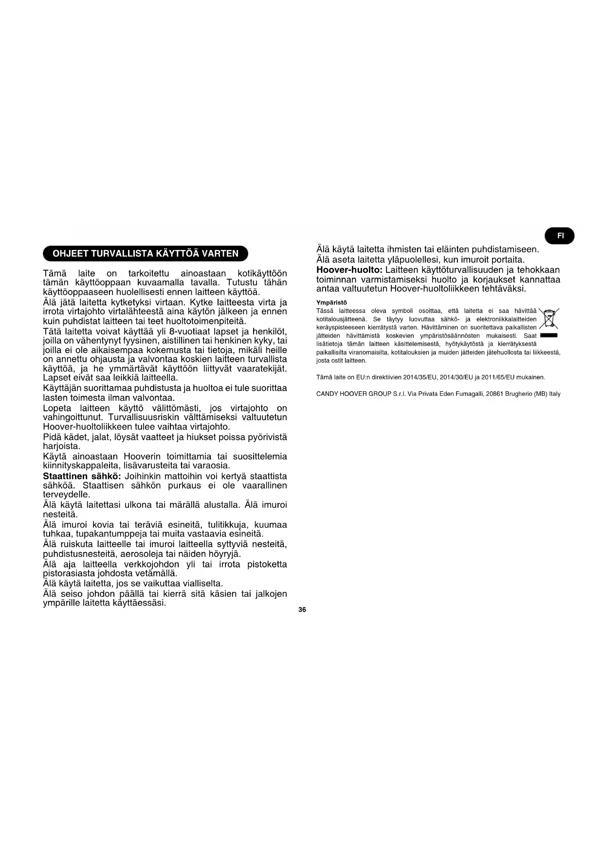 Tämä laite on tarkoitettu ainoastaan kotikäyttöön tämän käyttöoppaan kuvaamalla tavalla. Tutustu tähän käyttöoppaaseen huolellisesti ennen laitteen käyttöä. Älä jätä laitetta kytketyksi virtaan. Kytke laitteesta virta ja irrota virtajohto virtalähteestä aina käytön jälkeen ja ennen kuin puhdistat laitteen tai teet huoltotoimenpiteitä. Tätä laitetta voivat käyttää yli 8-vuotiaat lapset ja henkilöt, joilla on vähentynyt fyysinen, aistillinen tai henkinen kyky, tai joilla ei ole aikaisempaa kokemusta tai tietoja, mikäli heille on annettu ohjausta ja valvontaa koskien laitteen turvallista käyttöä, ja he ymmärtävät käyttöön liittyvät vaaratekijät. Lapset eivät saa leikkiä laitteella. Käyttäjän suorittamaa puhdistusta ja huoltoa ei tule suorittaa lasten toimesta ilman valvontaa. Lopeta laitteen käyttö välittömästi, jos virtajohto on vahingoittunut. Turvallisuusriskin välttämiseksi valtuutetun Hoover-huoltoliikkeen tulee vaihtaa virtajohto. Pidä kädet, jalat, löysät vaatteet ja hiukset poissa pyörivistä harjoista. Käytä ainoastaan Hooverin toimittamia tai suosittelemia kiinnityskappaleita, lisävarusteita tai varaosia. Staattinen sähkö: Joihinkin mattoihin voi kertyä staattista sähköä. Staattisen sähkön purkaus ei ole vaarallinen terveydelle. Älä käytä laitettasi ulkona tai märällä alustalla. Älä imuroi nesteitä. Älä imuroi kovia tai teräviä esineitä, tulitikkuja, kuumaa tuhkaa, tupakantumppeja tai muita vastaavia esineitä. Älä ruiskuta laitteelle tai imuroi laitteella syttyviä nesteitä, puhdistusnesteitä, aerosoleja tai näiden höyryjä. Älä aja laitteella verkkojohdon yli tai irrota pistoketta pistorasiasta johdosta vetämällä. Älä käytä laitetta, jos se vaikuttaa vialliselta. Älä seiso johdon päällä tai kierrä sitä käsien tai jalkojen ympärille laitetta käyttäessäsi. Älä käytä laitetta ihmisten tai eläinten puhdistamiseen. Älä aseta laitetta yläpuolellesi, kun imuroit portaita. Hoover-huolto: Laitteen käyttöturvallisuuden ja tehokkaan toiminnan varmistamiseksi huolto ja korjaukset kannattaa antaa valtuutetun Hoover-huoltoliikkeen tehtäväksi. Ympäristö Tässä laitteessa oleva symboli osoittaa, että laitetta ei saa hävittää kotitalousjätteenä. Se täytyy luovuttaa sähkö- ja elektroniikkalaitteiden keräyspisteeseen kierrätystä varten. Hävittäminen on suoritettava paikallisten jätteiden hävittämistä koskevien ympäristösäännösten mukaisesti. Saat lisätietoja tämän laitteen käsittelemisestä, hyötykäytöstä ja kierrätyksestä paikallisilta viranomaisilta, kotitalouksien ja muiden jätteiden jätehuollosta tai liikkeestä, josta ostit laitteen. Tämä laite on EU:n direktiivien 2014/35/EU, 2014/30/EU ja 2011/65/EU mukainen. CANDY HOOVER GROUP S.r.l. Via Privata Eden Fumagalli, 20861 Brugherio (MB) Italy37