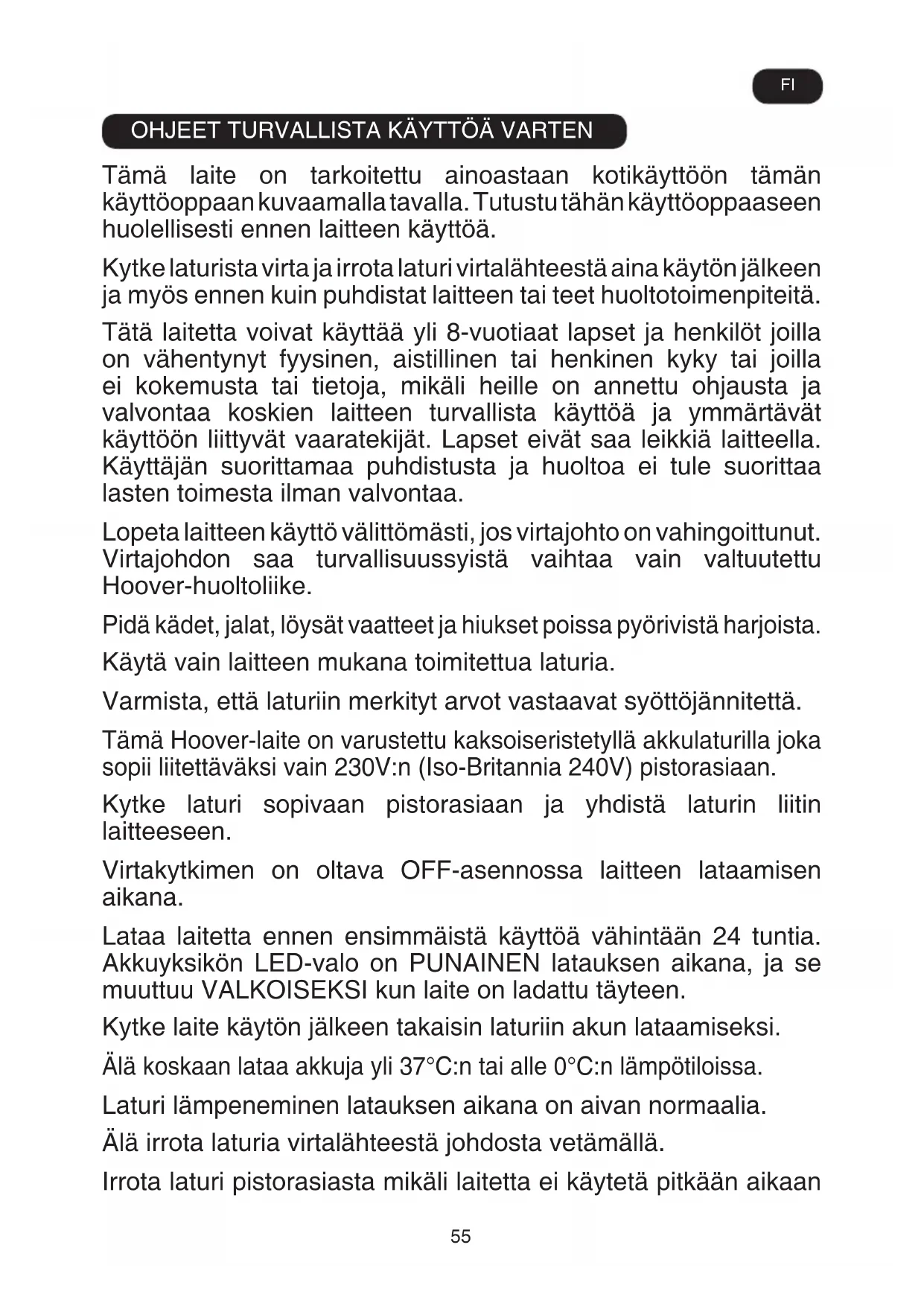 Tämä laite on tarkoitettu ainoastaan kotikäyttöön tämän käyttöoppaan kuvaamalla tavalla. Tutustu tähän käyttöoppaaseen huolellisesti ennen laitteen käyttöä. Kytke laturista virta ja irrota laturi virtalähteestä aina käytön jälkeen ja myös ennen kuin puhdistat laitteen tai teet huoltotoimenpiteitä. Tätä laitetta voivat käyttää yli 8-vuotiaat lapset ja henkilöt joilla on vähentynyt fyysinen, aistillinen tai henkinen kyky tai joilla ei kokemusta tai tietoja, mikäli heille on annettu ohjausta ja valvontaa koskien laitteen turvallista käyttöä ja ymmärtävät käyttöön liittyvät vaaratekijät. Lapset eivät saa leikkiä laitteella. Käyttäjän suorittamaa puhdistusta ja huoltoa ei tule suorittaa lasten toimesta ilman valvontaa. Lopeta laitteen käyttö välittömästi, jos virtajohto on vahingoittunut. Virtajohdon saa turvallisuussyistä vaihtaa vain valtuutettu Hoover-huoltoliike. Pidä kädet, jalat, löysät vaatteet ja hiukset poissa pyörivistä harjoista. Käytä vain laitteen mukana toimitettua laturia. Varmista, että laturiin merkityt arvot vastaavat syöttöjännitettä. Tämä Hoover-laite on varustettu kaksoiseristetyllä akkulaturilla joka sopii liitettäväksi vain 230V:n (Iso-Britannia 240V) pistorasiaan. Kytke laturi sopivaan pistorasiaan ja yhdistä laturin liitin laitteeseen. Virtakytkimen on oltava OFF-asennossa laitteen lataamisen aikana. Lataa laitetta ennen ensimmäistä käyttöä vähintään 24 tuntia. Akkuyksikön LED-valo on PUNAINEN latauksen aikana, ja se muuttuu VALKOISEKSI kun laite on ladattu täyteen. Kytke laite käytön jälkeen takaisin laturiin akun lataamiseksi. Älä koskaan lataa akkuja yli 37°C:n tai alle 0°C:n lämpötiloissa. Laturi lämpeneminen latauksen aikana on aivan normaalia. Älä irrota laturia virtalähteestä johdosta vetämällä. Irrota laturi pistorasiasta mikäli laitetta ei käytetä pitkään aikaan FI56 (loma-ajat jne.). Lataa laite uudelleen ennen käyttöä koska akut voivat purkaantua varauksesta pitkien säilytysjaksojen aikana. Jos laite hävitetään, akut on ensin poistettava laitteesta. Laitteen täytyy olla irroitettu verkkovirrasta akkua vaihdettaessa. Kierrätä akut turvallisesti. On suositeltavaa käyttää laitetta, kunnes se pysähtyy, jotta akut tyhjentyvät kokonaan. Vie käytetyt akut kierrätyskeskukseen. Älä hävitä niitä kotitalousjätteen mukana. Irrottaaksesi akut ota yhteyttä valtuutettuun Hoover- huoltoliikkeeseen tai noudata seuraavia ohjeita. TÄRKEÄÄ: Tyhjennä akut aina kokonaan ennen niiden poistamista. Käytä imuria kunnes akut ovat täysin tyhjät. Irrota laturin liitin laitteesta. Paina akkuyksikön vapautuspainikkeita ja irrota liu´uttamalla. [11] HUOMAA: Jos sinulla on vaikeuksia purkaa laitetta tai tarvitset yksityiskohtaisempaa tietoa laitteen jälkikäsittelystä, talteenotosta ja kierrätyksestä, ota yhteyttä paikallisiin kierrätysviranomaisiin tai kotitalouksien jätehuoltoon. Käytä ainoastaan Hooverin toimittamia tai suosittelemia lisävarusteita tai varaosia. Staattinen sähkö: Jotkut matot voivat aiheuttaa vähäisen määrän staattista sähköä. Staattisen sähkön purkaus ei ole vaarallinen terveydelle. Älä käytä laitettasi ulkona tai märällä alustalla. Älä imuroi nesteitä. Älä imuroi kovia tai teräviä esineitä, tulitikkuja, kuumaa tuhkaa, tupakantumppeja tai muita vastaavia esineitä. Älä ruiskuta laitteelle tai imuroi laitteella syttyviä nesteitä, puhdistusnesteitä, aerosoleja tai näiden höyryjä. Älä aja laitteella verkkojohdon yli tai irrota pistoketta pistorasiasta johdosta vetämällä. Älä käytä laitetta tai laturia, jos se vaikuttaa vialliselta. Hoover-huolto: Laitteen käyttöturvallisuuden ja tehokkaan toiminnan varmistamiseksi suosittelemme, että huolto ja korjaukset teetetään vain valtuutetussa Hoover-huollossa. FITUOTTEEN OSAT