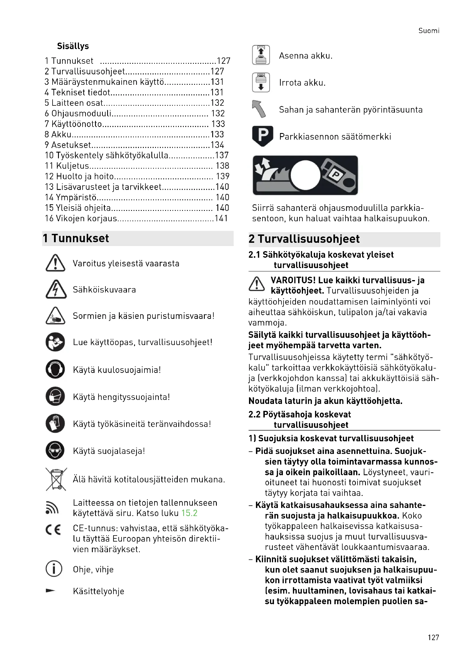 - 16 Vikojen korjaus 1 Tunnukset Varoitus yleisestä vaarasta Sähköiskuvaara Sormien ja käsien puristumisvaara! Lue käyttöopas, turvallisuusohjeet! Käytä kuulosuojaimia! Käytä hengityssuojainta! Käytä työkäsineitä teränvaihdossa! Käytä suojalaseja! Älä hävitä kotitalousjätteiden mukana. Laitteessa on tietojen tallennukseen käytettävä siru. Katso luku 15.2 CE-tunnus: vahvistaa, että sähkötyöka lu täyttää Euroopan yhteisön direktii vien määräykset. Ohje, vihje Käsittelyohje Asenna akku. Irrota akku. Sahan ja sahanterän pyörintäsuunta Parkkiasennon säätömerkki Siirrä sahanterä ohjausmoduulilla parkkia sentoon, kun haluat vaihtaa halkaisupuukon. 2 Turvallisuusohjeet p. 141
