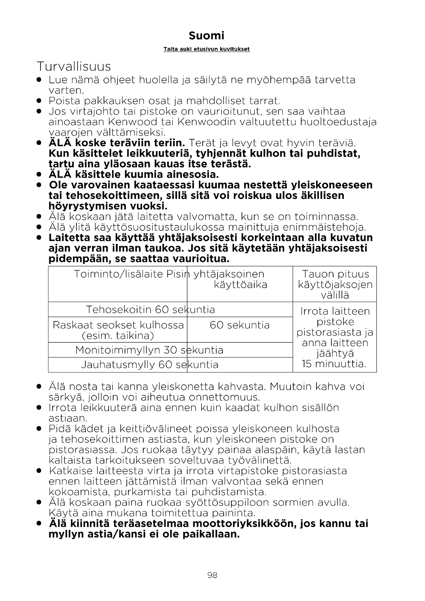 Laitetta saa käyttää yhtäjaksoisesti korkeintaan alla kuvatun ajan verran ilman taukoa. Jos sitä käytetään yhtäjaksoisesti pidempään, se saattaa vaurioitua. Toiminto/lisälaite Pisin yhtäjaksoinen käyttöaika Tauon pituus käyttöjaksojen välillä Tehosekoitin 60 sekuntia Irrota laitteen pistoke pistorasiasta ja anna laitteen jäähtyä 15 minuuttia. Raskaat seokset kulhossa (esim. taikina) 60 sekuntia Monitoimimyllyn 30 sekuntia Jauhatusmylly 60 sekuntia