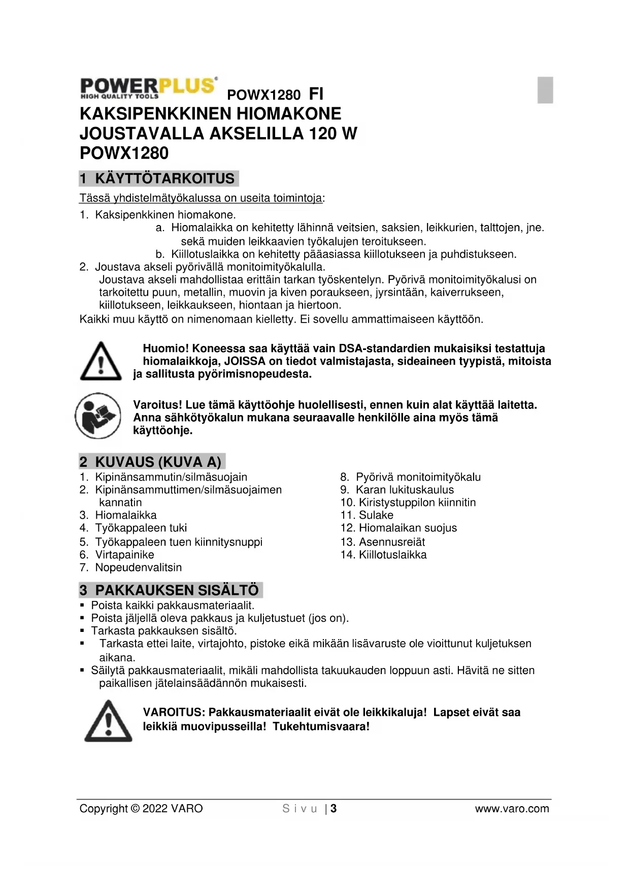 - Jos laitteeseen voidaan liittää pölynimuri ja keruulaite, varmista, että ne on kiinnitetty hyvin ja niitä käytetään oikein. Näiden laitteiden käyttö pienentää pölyn aiheuttamia vaaratilanteita.POWX1280 FI Copyright © 2022 VARO S i v u | 6 www.varo.com