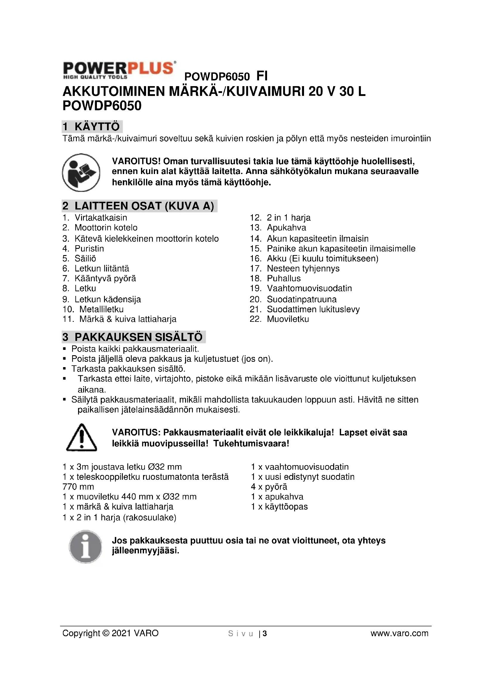 Copyright © 2021 VARO S i v u | 3 www.varo.com AKKUTOIMINEN MÄRKÄ-/KUIVAIMURI 20 V 30 L POWDP6050 1 KÄYTTÖ Tämä märkä-/kuivaimuri soveltuu sekä kuivien roskien ja pölyn että myös nesteiden imurointiin VAROITUS! Oman turvallisuutesi takia lue tämä käyttöohje huolellisesti, ennen kuin alat käyttää laitetta. Anna sähkötyökalun mukana seuraavalle henkilölle aina myös tämä käyttöohje. 2 LAITTEEN OSAT (KUVA A)