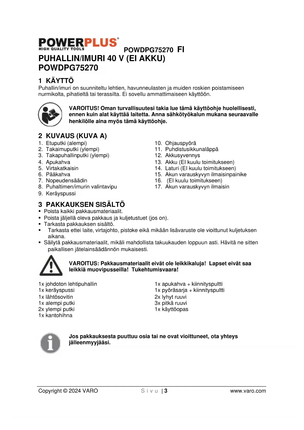 Copyright © 2024 VARO S i v u | 3 www.varo.com PUHALLIN/IMURI 40 V (EI AKKU) POWDPG75270 1 KÄYTTÖ Puhallin/imuri on suunniteltu lehtien, havunneulasten ja muiden roskien poistamiseen nurmikolta, pihatieltä tai terassilta. Ei sovellu ammattimaiseen käyttöön. VAROITUS! Oman turvallisuutesi takia lue tämä käyttöohje huolellisesti, ennen kuin alat käyttää laitetta. Anna sähkötyökalun mukana seuraavalle henkilölle aina myös tämä käyttöohje. 2 KUVAUS (KUVA A)