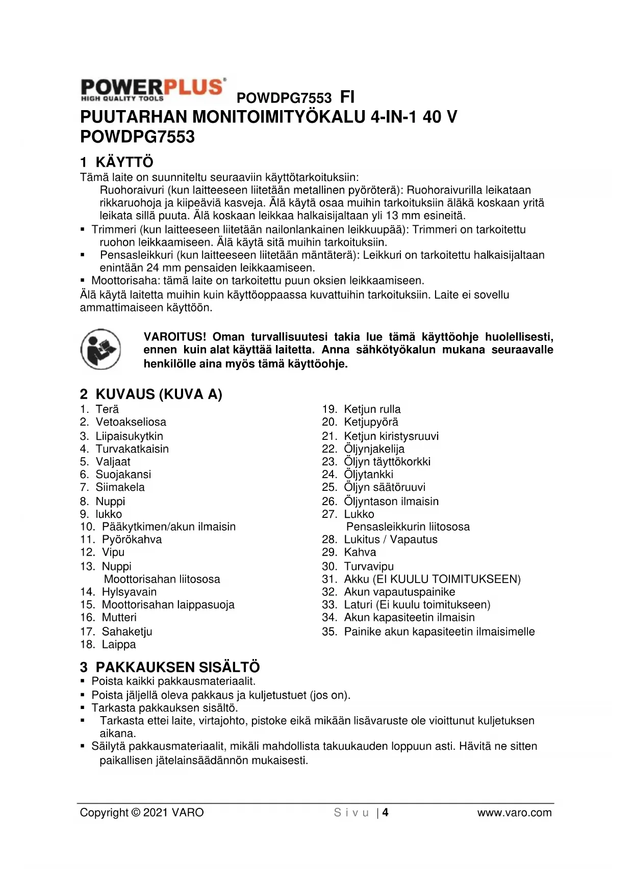 - Säilytä pakkausmateriaalit, mikäli mahdollista takuukauden loppuun asti. Hävitä ne sitten paikallisen jätelainsäädännön mukaisesti.POWDPG7553 FI Copyright © 2021 VARO S i v u | 5 www.varo.com VAROITUS: Pakkausmateriaalit eivät ole leikkikaluja! Lapset eivät saa leikkiä muovipusseilla! Tukehtumisvaara! 1x pensasleikkurin liitososa 1x moottorisahan liitososa 1x trimmerin/ruohoraivurin liitososa 1x rulla 1x leikkuuterä 1x kantovaljaat 1x laippasuoja 1x teräsuoja 1x suojus 1x hylsyavain 1x kuusioavain 1x ketju 1x laippa 1x käyttöohje Jos pakkauksesta puuttuu osia tai ne ovat vioittuneet, ota yhteys jälleenmyyjääsi. 4 SYMBOLIT Seuraavia symboleja käytetään tässä ohjekirjassa ja/tai koneen päällä: