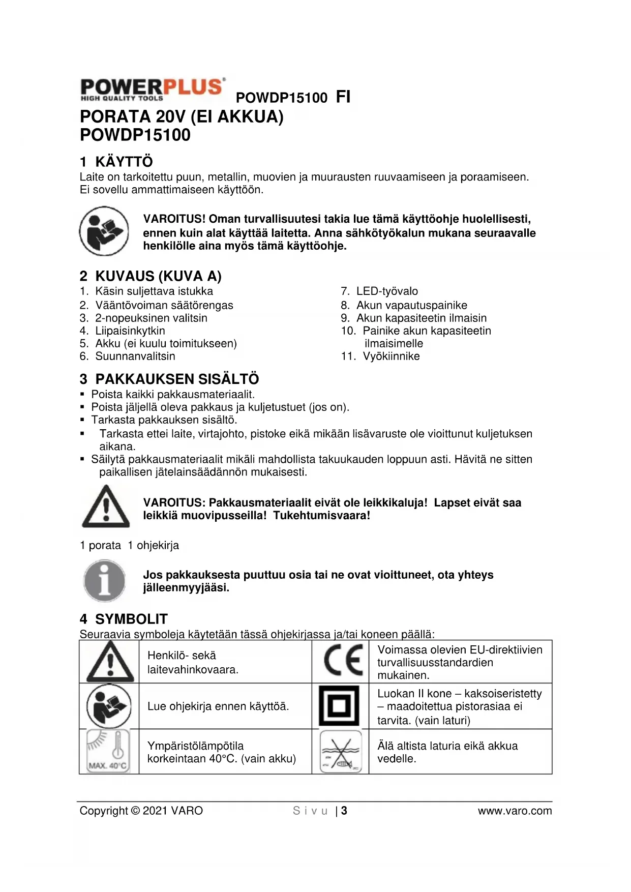 - Jos joudut poistamaan laitteen käytöstä pitkäaikaisen käytön jälkeen, älä hävitä sitä tavallisen kotitalousjätteen mukana, vaan huolehdi sen hävittämisestä ympäristöä suojaavalla tavalla. Sähkölaitteista jäävää romua ei saa hävittää tavallisen kotitalousjätteen tapaan. Vie se kierrätettäväksi mikäli mahdollista. Kysy neuvoa kierrätyksestä paikallisilta viranomaisilta tai jälleenmyyjältä.POWDP15100 FI Copyright © 2021 VARO S i v u | 13 www.varo.com 16 VAATIMUSTENMUKAISUUSVAKUUTUS VARO – Vic. Van Rompuy N.V. - Joseph Van Instraat 9 - BE2500 Lier - BELGIA ilmoittaa, että Tuote: Porata 20V Tavaramerkki: PowerPlus Malli: POWDP15100 on yhdenmukaistettuihin eurooppalaisiin standardien soveltamiseen perustuvien sovellettavien eurooppalaisten direktiivien olennaisten vaatimusten ja muiden asiaankuuluvien säännösten mukainen. Laitteen luvaton muokkaaminen johtaa tämän vakuutuksen mitätöitymiseen. Euroopan yhteisön direktiivit (sekä niiden mahdolliset muutokset allekirjoituspäivään saakka): 2011/65/EU 2006/42/EC 2014/30/EU Eurooppalaiset yhdenmukaistetut standardit (sekä niiden mahdolliset muutokset allekirjoituspäivään saakka): EN62841-1 : 2015 EN62841-2-1 : 2018 EN55014-1 : 2017 EN55014-2 : 2015 Teknisten asiakirjojen haltija: Philippe Vankerkhove, VARO – Vic Van Rompuy N.V. Allekirjoittanut toimii yrityksen toimitusjohtajan puolesta, Ludo Mertens Sääntelyasiat – vaatimuksenmukaisuudesta vastaava johtaja 24/03/2021, Lier - BelgiumPOWDP15100 EL Copyright © 2021 VARO Σ ε λ ί δ α | 1 www.varo.com 1 ΕΦΑΡΜΟΓΗ p. 3