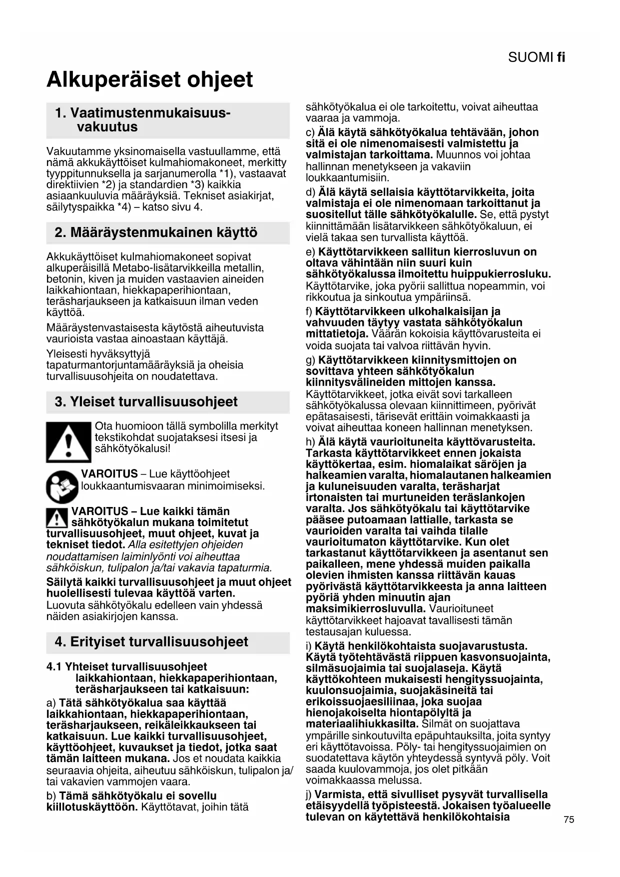 Alkuperäiset ohjeet Vakuutamme yksinomaisella vastuullamme, että nämä akkukäyttöiset kulmahiomakoneet, merkitty tyyppitunnuksella ja sarjanumerolla *1), vastaavat direktiivien *2) ja standardien *3) kaikkia asiaankuuluvia määräyksiä. Tekniset asiakirjat, säilytyspaikka *4) – katso sivu 4. Akkukäyttöiset kulmahiomakoneet sopivat alkuperäisillä Metabo-lisätarvikkeilla metallin, betonin, kiven ja muiden vastaavien aineiden laikkahiontaan, hiekkapaperihiontaan, teräsharjaukseen ja katkaisuun ilman veden käyttöä. Määräystenvastaisesta käytöstä aiheutuvista vaurioista vastaa ainoastaan käyttäjä. Yleisesti hyväksyttyjä tapaturmantorjuntamääräyksiä ja oheisia turvallisuusohjeita on noudatettava. Ota huomioon tällä symbolilla merkityt tekstikohdat suojataksesi itsesi ja sähkötyökalusi! VAROITUS – Lue käyttöohjeet loukkaantumisvaaran minimoimiseksi. VAROITUS – Lue kaikki tämän sähkötyökalun mukana toimitetut turvallisuusohjeet, muut ohjeet, kuvat ja tekniset tiedot. Alla esitettyjen ohjeiden noudattamisen laiminlyönti voi aiheuttaa sähköiskun, tulipalon ja/tai vakavia tapaturmia. Säilytä kaikki turvallisuusohjeet ja muut ohjeet huolellisesti tulevaa käyttöä varten. Luovuta sähkötyökalu edelleen vain yhdessä näiden asiakirjojen kanssa.
