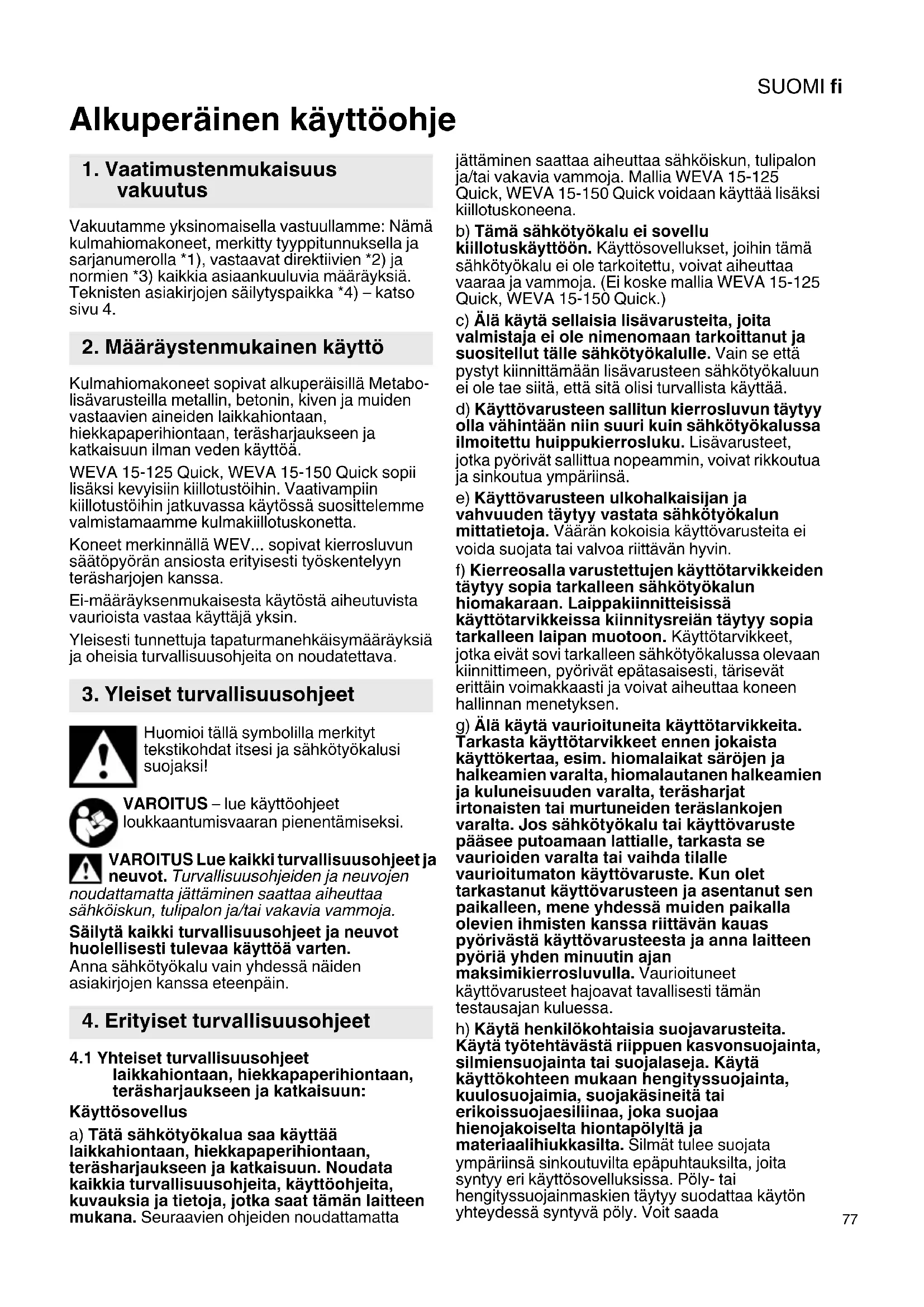 Alkuperäinen käyttöohje Vakuutamme yksinomaisella vastuullamme: Nämä kulmahiomakoneet, merkitty tyyppitunnuksella ja sarjanumerolla *1), vastaavat direktiivien *2) ja normien *3) kaikkia asiaankuuluvia määräyksiä. Teknisten asiakirjojen säilytyspaikka *4) – katso sivu 4. Kulmahiomakoneet sopivat alkuperäisillä Metabo- lisävarusteilla metallin, betonin, kiven ja muiden vastaavien aineiden laikkahiontaan, hiekkapaperihiontaan, teräsharjaukseen ja katkaisuun ilman veden käyttöä. WEVA 15-125 Quick, WEVA 15-150 Quick sopii lisäksi kevyisiin kiillotustöihin. Vaativampiin kiillotustöihin jatkuvassa käytössä suosittelemme valmistamaamme kulmakiillotuskonetta. Koneet merkinnällä WEV... sopivat kierrosluvun säätöpyörän ansiosta erityisesti työskentelyyn teräsharjojen kanssa. Ei-määräyksenmukaisesta käytöstä aiheutuvista vaurioista vastaa käyttäjä yksin. Yleisesti tunnettuja tapaturmanehkäisymääräyksiä ja oheisia turvallisuusohjeita on noudatettava. Huomioi tällä symbolilla merkityt tekstikohdat itsesi ja sähkötyökalusi suojaksi! VAROITUS – lue käyttöohjeet loukkaantumisvaaran pienentämiseksi. VAROITUS Lue kaikki turvallisuusohjeet ja neuvot. Turvallisuusohjeiden ja neuvojen noudattamatta jättäminen saattaa aiheuttaa sähköiskun, tulipalon ja/tai vakavia vammoja. Säilytä kaikki turvallisuusohjeet ja neuvot huolellisesti tulevaa käyttöä varten. Anna sähkötyökalu vain yhdessä näiden asiakirjojen kanssa eteenpäin.
