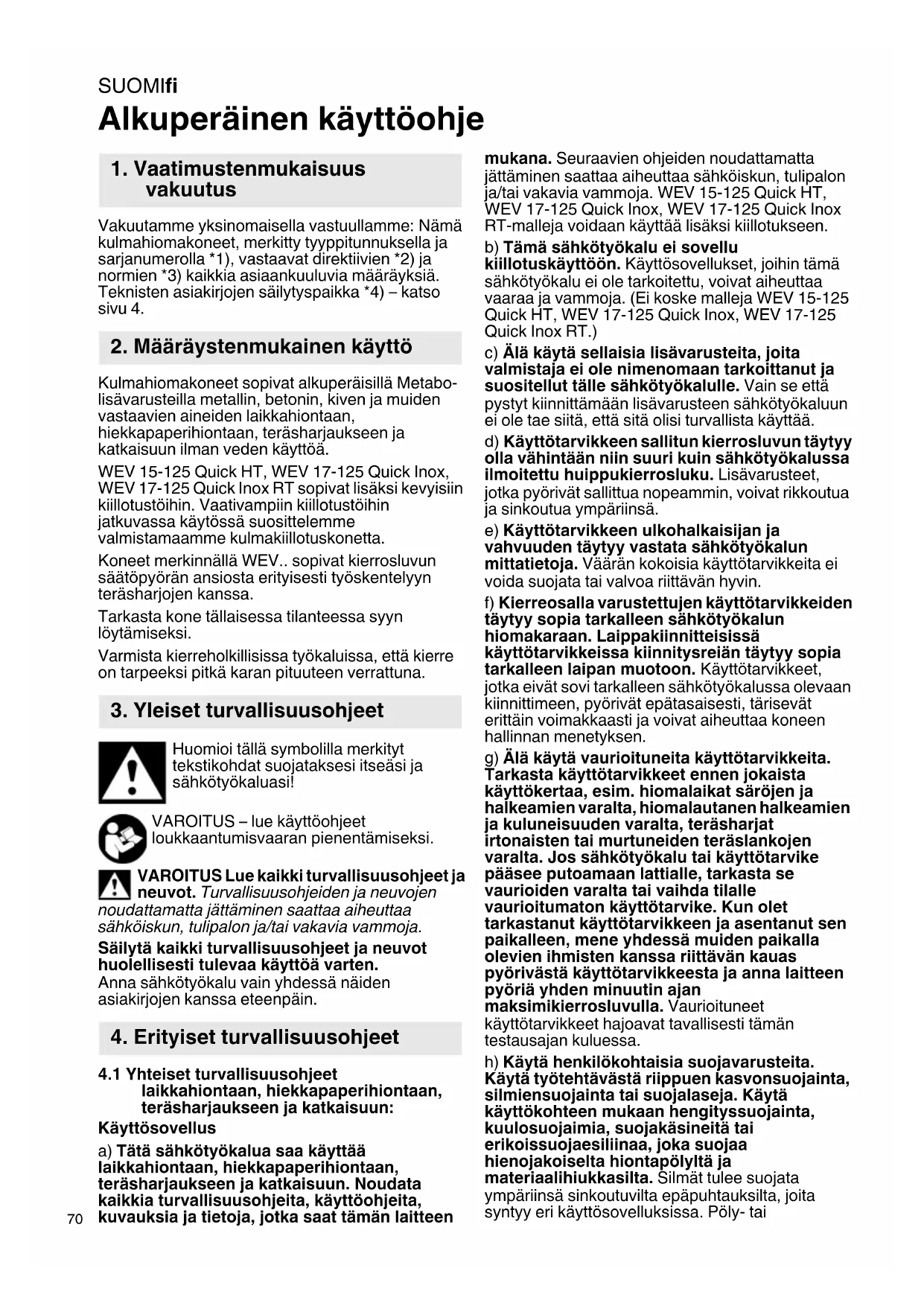 Alkuperäinen käyttöohje Vakuutamme yksinomaisella vastuullamme: Nämä kulmahiomakoneet, merkitty tyyppitunnuksella ja sarjanumerolla *1), vastaavat direktiivien *2) ja normien *3) kaikkia asiaankuuluvia määräyksiä. Teknisten asiakirjojen säilytyspaikka *4) – katso sivu 4. Kulmahiomakoneet sopivat alkuperäisillä Metabo- lisävarusteilla metallin, betonin, kiven ja muiden vastaavien aineiden laikkahiontaan, hiekkapaperihiontaan, teräsharjaukseen ja katkaisuun ilman veden käyttöä. WEV 15-125 Quick HT, WEV 17-125 Quick Inox, WEV 17-125 Quick Inox RT sopivat lisäksi kevyisiin kiillotustöihin. Vaativampiin kiillotustöihin jatkuvassa käytössä suosittelemme valmistamaamme kulmakiillotuskonetta. Koneet merkinnällä WEV.. sopivat kierrosluvun säätöpyörän ansiosta erityisesti työskentelyyn teräsharjojen kanssa. Tarkasta kone tällaisessa tilanteessa syyn löytämiseksi. Varmista kierreholkillisissa työkaluissa, että kierre on tarpeeksi pitkä karan pituuteen verrattuna. Huomioi tällä symbolilla merkityt tekstikohdat suojataksesi itseäsi ja sähkötyökaluasi! VAROITUS – lue käyttöohjeet loukkaantumisvaaran pienentämiseksi. VAROITUS Lue kaikki turvallisuusohjeet ja neuvot. Turvallisuusohjeiden ja neuvojen noudattamatta jättäminen saattaa aiheuttaa sähköiskun, tulipalon ja/tai vakavia vammoja. Säilytä kaikki turvallisuusohjeet ja neuvot huolellisesti tulevaa käyttöä varten. Anna sähkötyökalu vain yhdessä näiden asiakirjojen kanssa eteenpäin.
