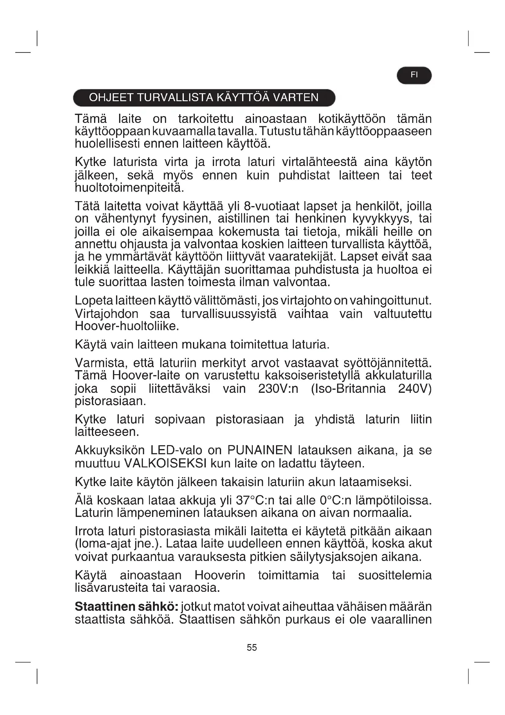 Tämä laite on tarkoitettu ainoastaan kotikäyttöön tämän käyttöoppaan kuvaamalla tavalla. Tutustu tähän käyttöoppaaseen huolellisesti ennen laitteen käyttöä. Kytke laturista virta ja irrota laturi virtalähteestä aina käytön jälkeen, sekä myös ennen kuin puhdistat laitteen tai teet huoltotoimenpiteitä. Tätä laitetta voivat käyttää yli 8-vuotiaat lapset ja henkilöt, joilla on vähentynyt fyysinen, aistillinen tai henkinen kyvykkyys, tai joilla ei ole aikaisempaa kokemusta tai tietoja, mikäli heille on annettu ohjausta ja valvontaa koskien laitteen turvallista käyttöä, ja he ymmärtävät käyttöön liittyvät vaaratekijät. Lapset eivät saa leikkiä laitteella. Käyttäjän suorittamaa puhdistusta ja huoltoa ei tule suorittaa lasten toimesta ilman valvontaa. Lopeta laitteen käyttö välittömästi, jos virtajohto on vahingoittunut. Virtajohdon saa turvallisuussyistä vaihtaa vain valtuutettu Hoover-huoltoliike. Käytä vain laitteen mukana toimitettua laturia. Varmista, että laturiin merkityt arvot vastaavat syöttöjännitettä. Tämä Hoover-laite on varustettu kaksoiseristetyllä akkulaturilla joka sopii liitettäväksi vain 230V:n (Iso-Britannia 240V) pistorasiaan. Kytke laturi sopivaan pistorasiaan ja yhdistä laturin liitin laitteeseen. Akkuyksikön LED-valo on PUNAINEN latauksen aikana, ja se muuttuu VALKOISEKSI kun laite on ladattu täyteen. Kytke laite käytön jälkeen takaisin laturiin akun lataamiseksi. Älä koskaan lataa akkuja yli 37°C:n tai alle 0°C:n lämpötiloissa. Laturin lämpeneminen latauksen aikana on aivan normaalia. Irrota laturi pistorasiasta mikäli laitetta ei käytetä pitkään aikaan (loma-ajat jne.). Lataa laite uudelleen ennen käyttöä, koska akut voivat purkaantua varauksesta pitkien säilytysjaksojen aikana. Käytä ainoastaan Hooverin toimittamia tai suosittelemia lisävarusteita tai varaosia. Staattinen sähkö: jotkut matot voivat aiheuttaa vähäisen määrän staattista sähköä. Staattisen sähkön purkaus ei ole vaarallinen FI56 terveydelle. Pidä kädet, jalat, löysät vaatteet ja hiukset poissa pyörivistä harjoista. Älä irrota laturia virtalähteestä johdosta vetämällä. Älä käytä laitettasi ulkona tai märällä alustalla. Älä imuroi nesteitä. Älä imuroi kovia tai teräviä esineitä, tulitikkuja, kuumaa tuhkaa, tupakantumppeja tai muita vastaavia esineitä. Älä ruiskuta laitteelle tai imuroi laitteella syttyviä nesteitä, puhdistusnesteitä, aerosoleja tai näiden höyryjä. Älä aja laitteella verkkojohdon yli tai irrota pistoketta pistorasiasta johdosta vetämällä. Älä käytä laitetta tai laturia, jos se vaikuttaa vialliselta. Älä käytä laitetta ihmisten tai eläinten puhdistamiseen. Älä vaihda akkuja ei- ladattaviin akkuihin. Hoover-huolto: Laitteen käyttöturvallisuuden ja tehokkaan toiminnan varmistamiseksi suosittelemme, että huolto ja korjaukset teetetään vain valtuutetussa Hoover-huollossa. Tuotteen hävittäminen käyttöiän päätyttyä Jos laite hävitetään, akut on ensin poistettava laitteesta. Laitteen täytyy olla irrotettu verkkovirrasta akkua vaihdettaessa. Kierrätä akut turvallisesti. On suositeltavaa käyttää laitetta, kunnes se pysähtyy, jotta akut tyhjentyvät kokonaan. Vie käytetyt akut kierrätyskeskukseen. Älä hävitä niitä kotitalousjätteen mukana. Irrottaaksesi akut ota yhteyttä valtuutettuun Hoover- huoltoliikkeeseen tai noudata seuraavia ohjeita. TÄRKEÄÄ: Tyhjennä akut aina kokonaan ennen niiden poistamista. Käytä imuria kunnes akut ovat täysin tyhjät. Irrota laturin liitin laitteesta. Paina akkuyksikön vapautuspainikkeita ja irrota liu´uttamalla. Huomaa: Jos sinulla on vaikeuksia purkaa laitetta tai tarvitset yksityiskohtaisempaa tietoa laitteen jälkikäsittelystä, talteenotosta ja kierrätyksestä, ota yhteyttä paikallisiin kierrätysviranomaisiin tai kotitalouksien jätehuoltoon. FITUOTTEEN OSAT