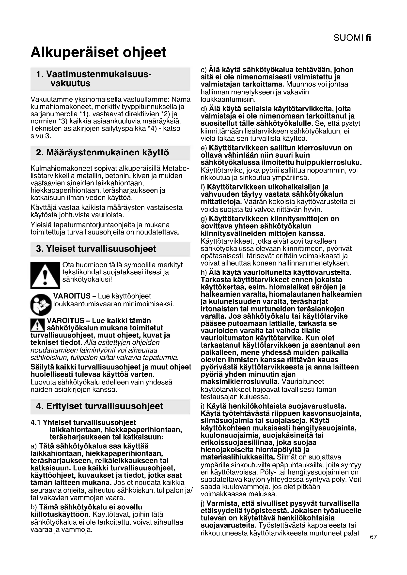 Alkuperäiset ohjeet Vakuutamme yksinomaisella vastuullamme: Nämä kulmahiomakoneet, merkitty tyyppitunnuksella ja sarjanumerolla *1), vastaavat direktiivien *2) ja normien *3) kaikkia asiaankuuluvia määräyksiä. Teknisten asiakirjojen säilytyspaikka *4) - katso sivu 3. Kulmahiomakoneet sopivat alkuperäisillä Metabo- lisätarvikkeilla metallin, betonin, kiven ja muiden vastaavien aineiden laikkahiontaan, hiekkapaperihiontaan, teräsharjaukseen ja katkaisuun ilman veden käyttöä. Käyttäjä vastaa kaikista määräysten vastaisesta käytöstä johtuvista vaurioista. Yleisiä tapaturmantorjuntaohjeita ja mukana toimitettuja turvallisuusohjeita on noudatettava. Ota huomioon tällä symbolilla merkityt tekstikohdat suojataksesi itsesi ja sähkötyökalusi! VAROITUS – Lue käyttöohjeet loukkaantumisvaaran minimoimiseksi. VAROITUS – Lue kaikki tämän sähkötyökalun mukana toimitetut turvallisuusohjeet, muut ohjeet, kuvat ja tekniset tiedot. Alla esitettyjen ohjeiden noudattamisen laiminlyönti voi aiheuttaa sähköiskun, tulipalon ja/tai vakavia tapaturmia. Säilytä kaikki turvallisuusohjeet ja muut ohjeet huolellisesti tulevaa käyttöä varten. Luovuta sähkötyökalu edelleen vain yhdessä näiden asiakirjojen kanssa.