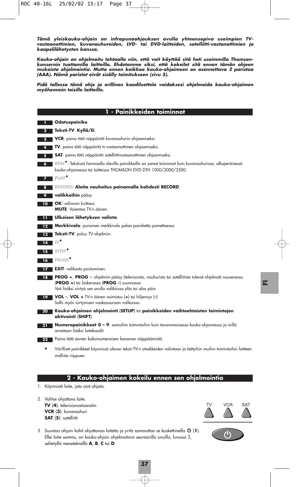25/02/02 15:17 Page 37 Tämä yleiskauko-ohjain on infrapunaohjauksen avulla yhteensopiva useimpien TVvastaanottimien, kuvanauhureiden, LVD- tai DVD-laitteiden, satelliitti-vastanottimien ja kaapelilähetysten kanssa. Kauko-ohjain on ohjelmoitu tehtaalla niin, että voit käyttää sitä heti useimmilla Thomsonkonsernin tuottamilla laitteilla. Ehdotamme siksi, että kokeilet sitä ennen tämän ohjeen mukaista ohjelmointia. Mutta ennen kaikkea kauko-ohjaimeen on asennettava 2 paristoa (AAA). Nämä paristot eivät sisälly toimitukseen (sivu 5). Pidä tallessa tämä ohje ja erillinen koodiluettelo voidaksesi ohjelmoida kauko-ohjaimen myöhemmin toisille laitteille.
